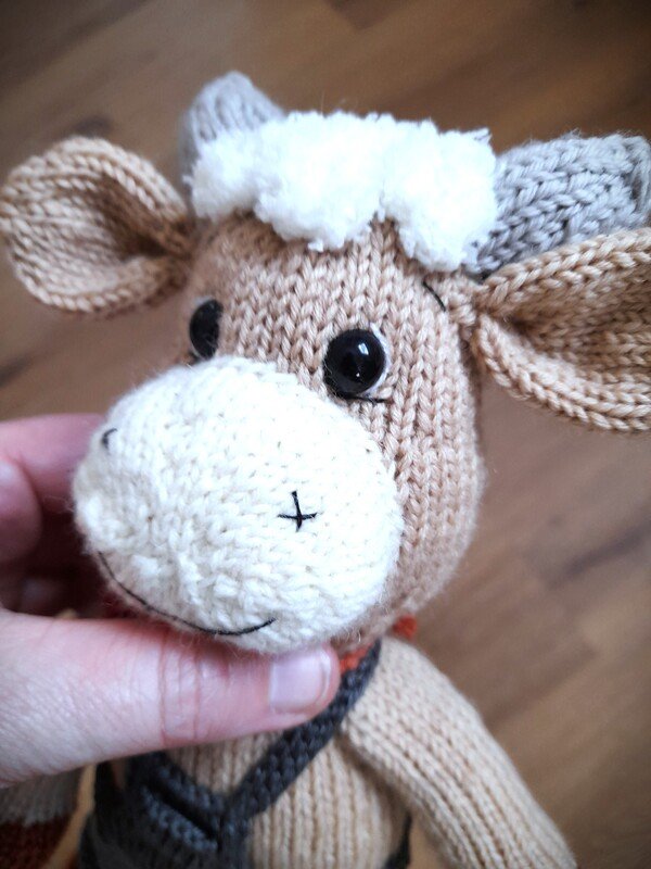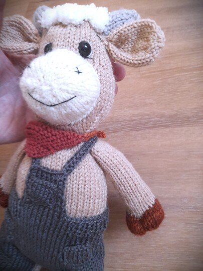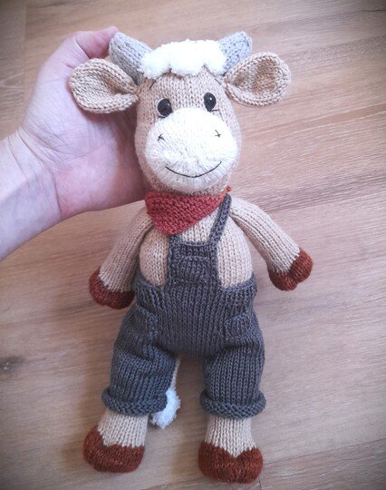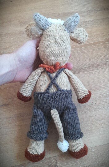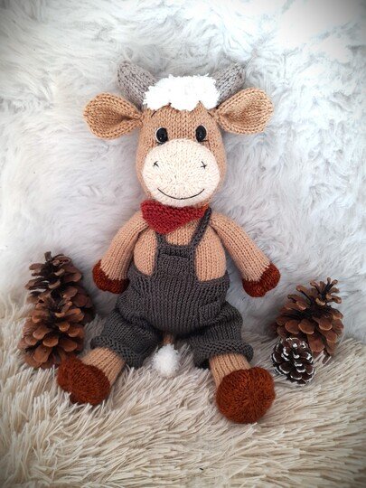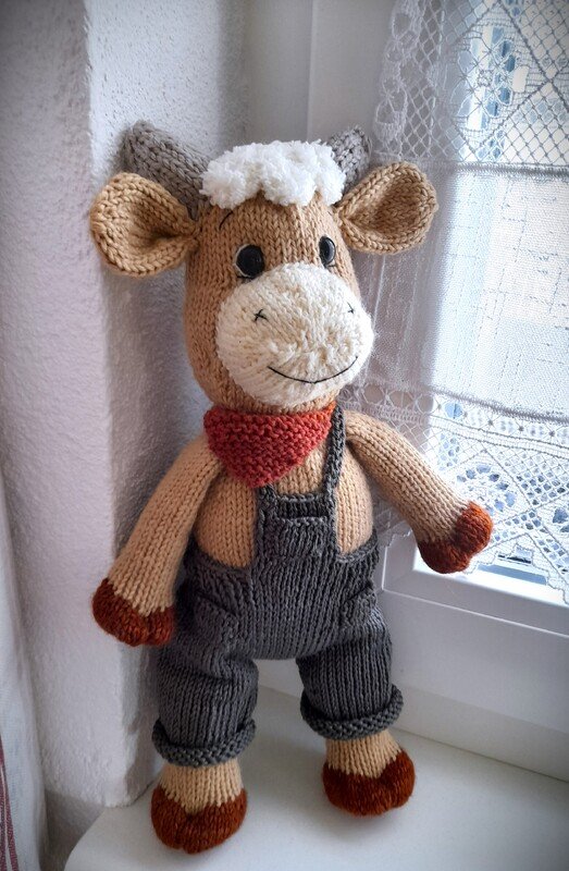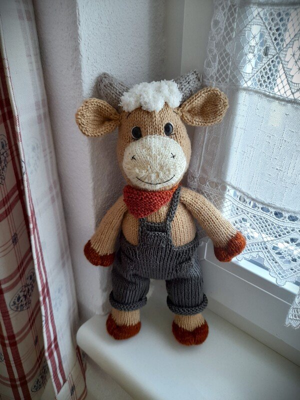 Die Anleitung beschreibt auf 19 Seiten ausführlich mit zahlreichen Fotos wie du ganz einfach Schritt für Schritt die Kuhe, die Latzhose und das Halstuch stricken kannst.