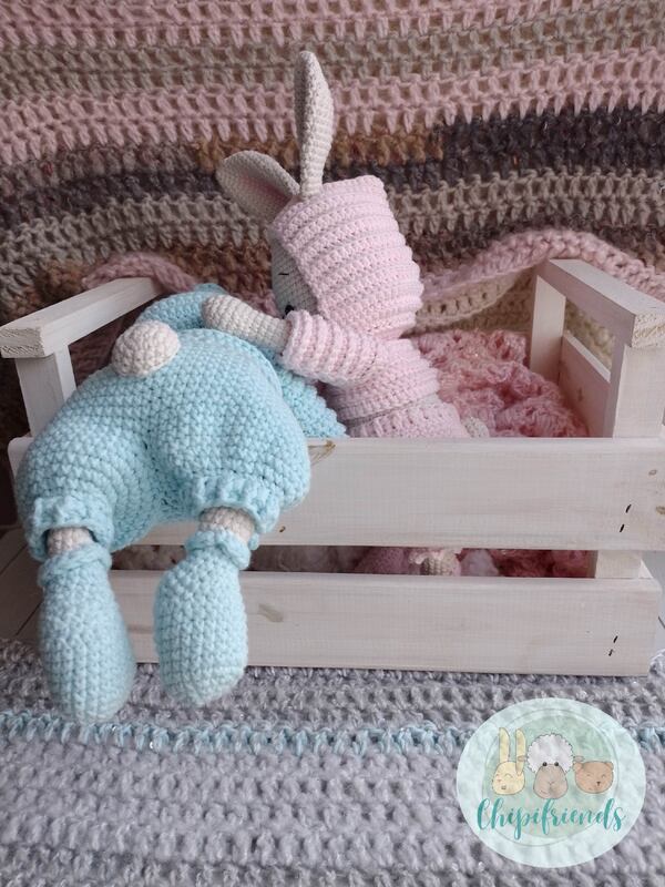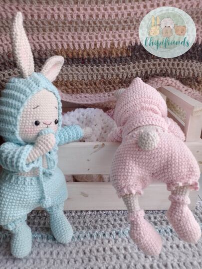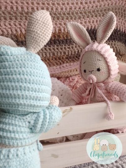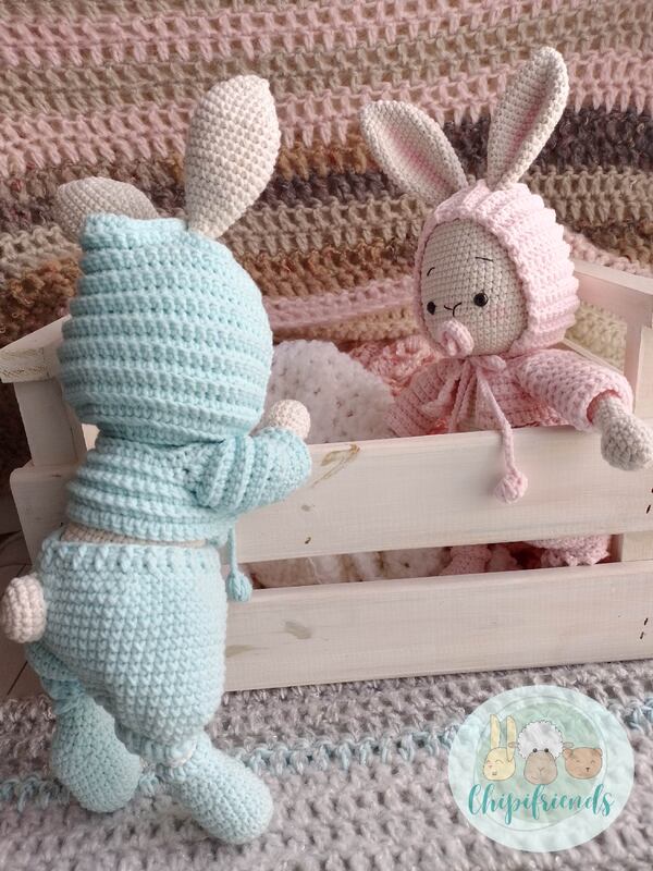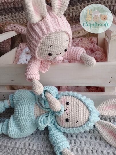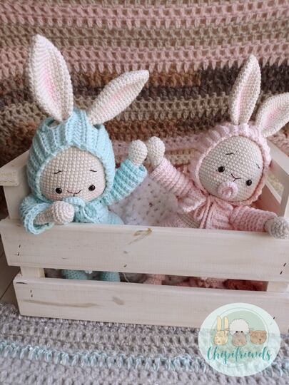 Das PDF enthält eine Anleitung mit leicht lesbaren Bildern zur Herstellung einer niedlichen Hasen Zwillinge.