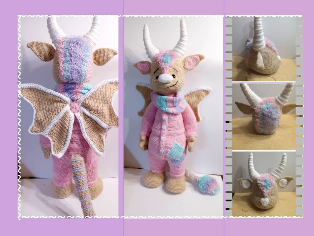 Das Drachenbaby habe ich mit Woll Butt Versailles und einer Nadelstärke von 2,0 gehäkelt und es hat eine Größe von ca. 65 cm.