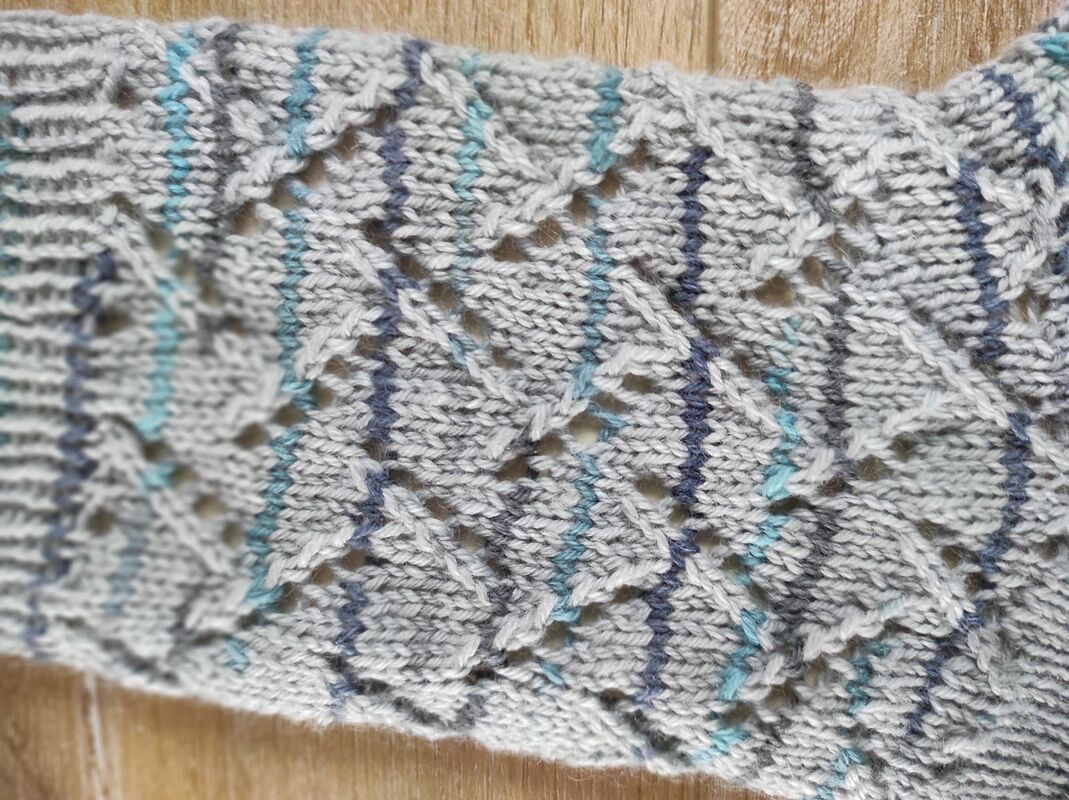 Ein frühlingshaftes Zackenmuster mit Lochstreifen macht so richtig Lust auf wärmere Termperaturen. Die zarten Farbstreifen des hellgrauen Garns unterstreichen den frühlingshaften Eindruck. Übrigens ein richtiges Luxusgarn mit 10% Kaschmiranteil, daher herrlich weich. Es lässt sich super verstricken und zeigt ein klares Maschenbild, ideal für das Lochmuster. Also falls es im Frühling gegen Abend dann doch wieder kühler werden sollte, seid Ihr perfekt ausgerüstet.