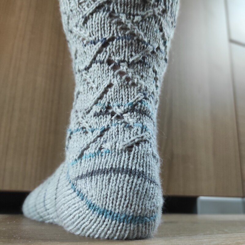 Die Socken sind mit Bumerang-Ferse gestrickt, eine detaillierte Anleitung dazu ist enthalten. Die Ferse kann gegen andere Fersenalternativen ausgetauscht werden, diese sind jedoch nicht in der Anleitung enthalten.