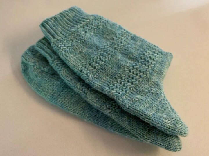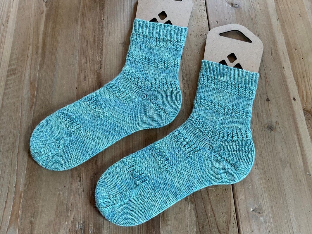 Die Mustersocken sind aus Sockenwolle von Lana Grossa, Meilenweit Socktober by Tanja Steinbach , [75% Wolle, 25 % Polyamid], in der Farbe türkis, FB 4321