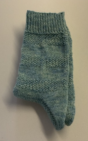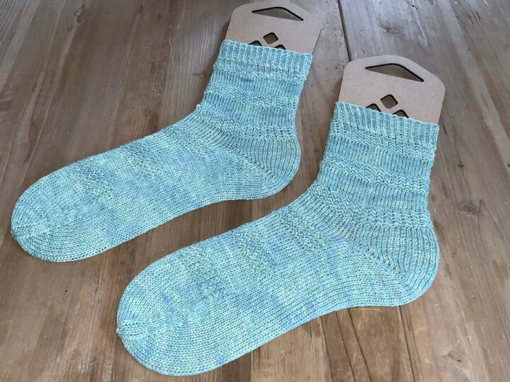 „Belle“, Socken mit Musterstreifen. Die Socken werden von oben nach unten gestrickt. Die Grundlagen des Sockenstrickens sollten bekannt sein. Ich habe die Ferse als Bumerangferse gearbeitet und eine Bandspitze gestrickt und beschrieben. Ferse und Spitze können jedoch auch anders ausgeführt werden.