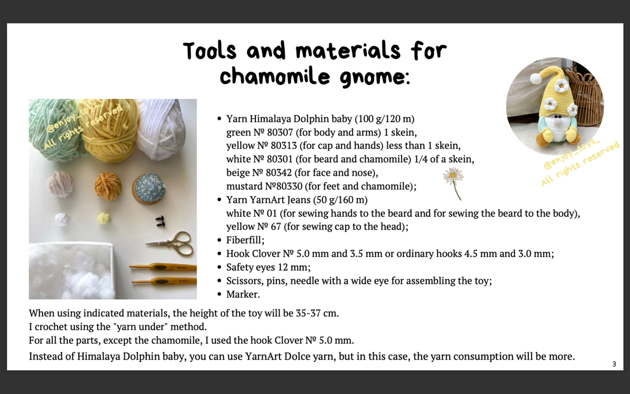 For all the parts, except the chamomile, I used the hook Clover No 5.0 mm.