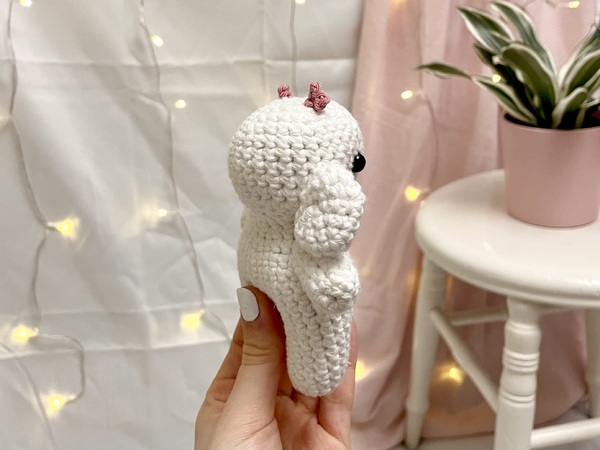 Das Monster wird mit Flauschgarn ca. 11 cm groß. In der Anleitung sind noch zwei weitere Garnarten (Chunky 15 cm und Baumwolle 12 cm) beschrieben.