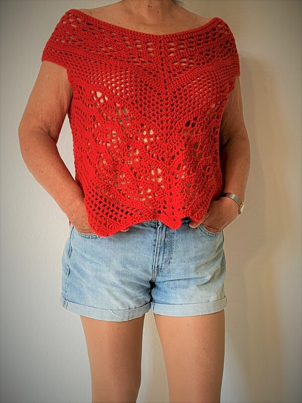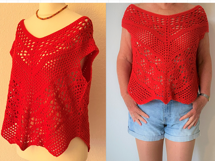 Dieses Sommertopp hat eine besondere Form – ein großes V -und ist der Hingucker schlechthin. Es ist sehr schnell gehäkelt, falls ihr es eilig habt, denn die Wolle hat nur eine Lauflänge von 100 m auf 50 g und wird mit großer Nadel (5) gehäkelt. Es besteht in seiner ganzer Länge nur aus 28 Reihen (Größe M und L).