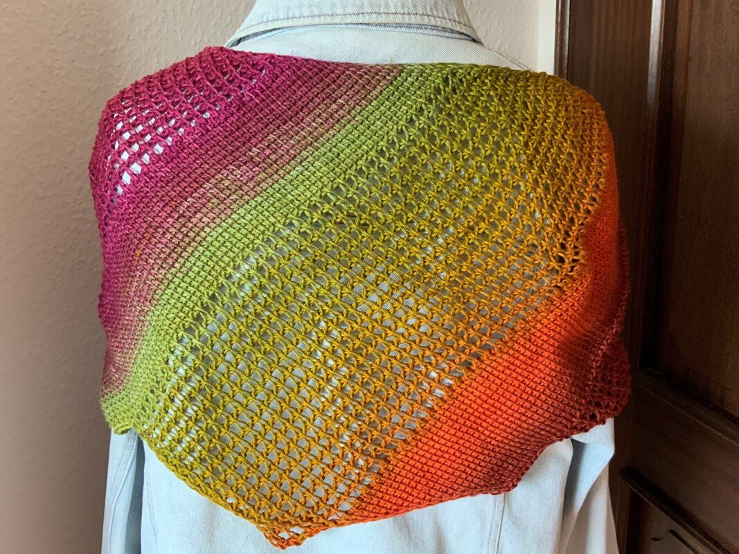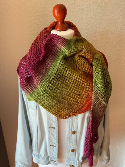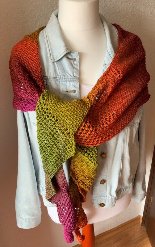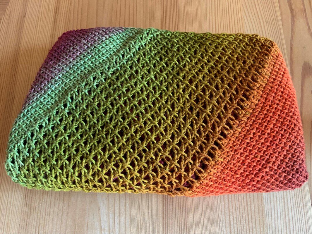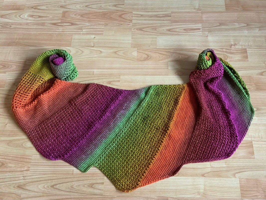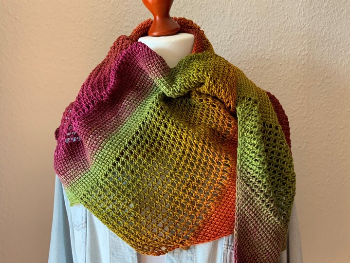 „Blandine“ ist ein farbenfrohes, im tunesischem Grundstich und tunesischem Gittermuster (mit Umschlägen) gehäkeltes asymmetrisches Drachentuch.