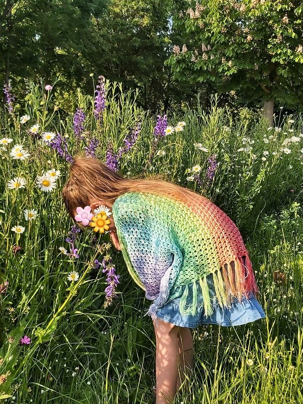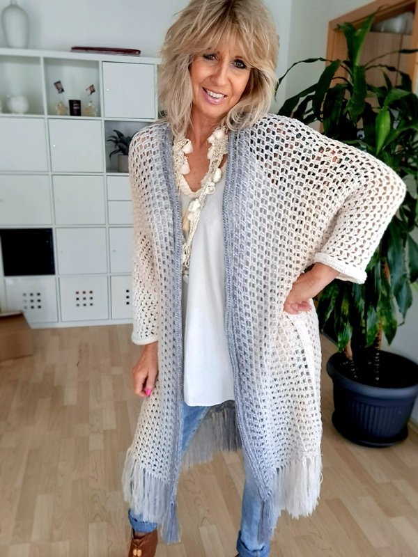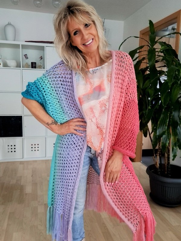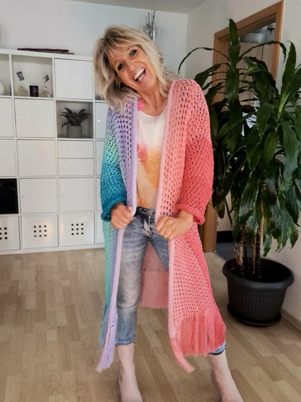 Der Longdreamy ist ein luftiger Häkelmantel,