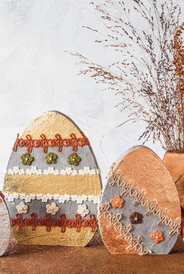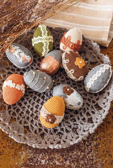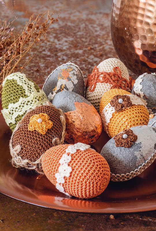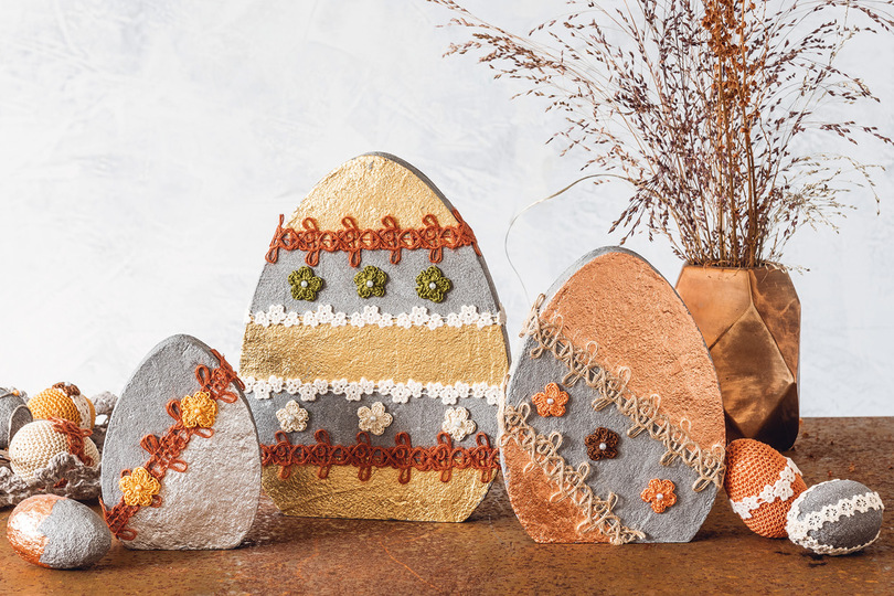 So vielfältig kann Oster-Deko sein. Drei verschiedene Ausgangsmaterialien, mal Beton selbst gegossen, mal Holz bemalt und mit Häkelborte, mal Holz ganz umhäkelt mit festen Maschen. Dazu kleine Perlen auf Mini-Häkelblüten, die das Ganze zusätzlich hübsch verzieren. Kreative BastlerInnen, die die Abwechslung lieben, kommen hier ganz auf ihre Kosten. Wer nicht so aufs Häkeln steht, nimmt fertige Schmucklitze und beklebt damit die Beton- oder bemalten Holzeier. Eine detaillierte Anleitung steht für alle Exemplare zur Verfügung.