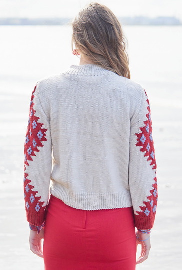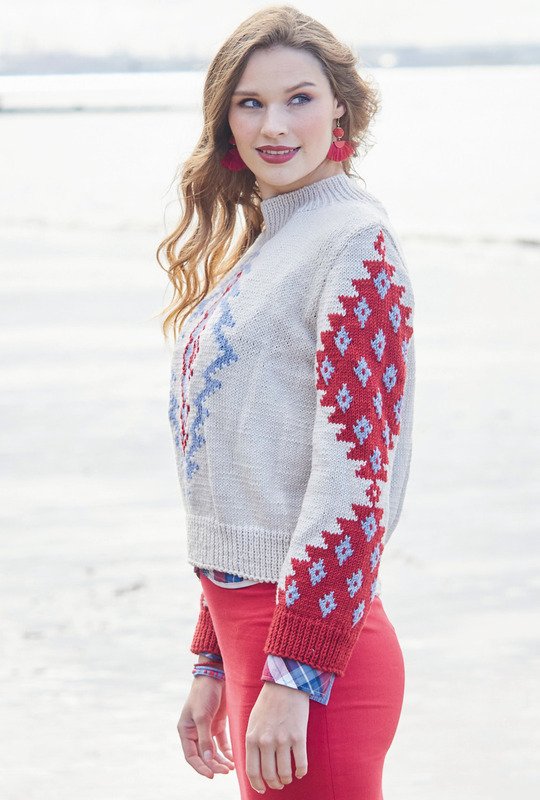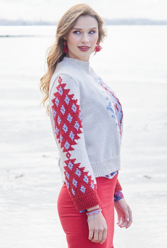 Rauten stehen im Vordergrund dieses Pullis aus reiner Schurwolle. Die geraden weiten Ärmel sind mit zwei großen roten Rauten gearbeitet, die innerhalb kleine Rauten in Hellblau haben. Das Rückenteil wird ganz in Natur gestrickt. Im Vorderteil kommt wiederum eine langgezogene Raute zur Geltung, die innerhalb mit roten Maschenstichen umstickt wird. Alle Bündchen, auch die breite Blende am runden Halsausschnitt, sind in 1/1-Rippen gearbeitet. Das Besondere an der Ausschnittblende ist, dass die Maschen italienisch abgenäht werden. Die Anleitung zum Downloaden gibt es in den Größen 36/38, 40/42 und 44/46.