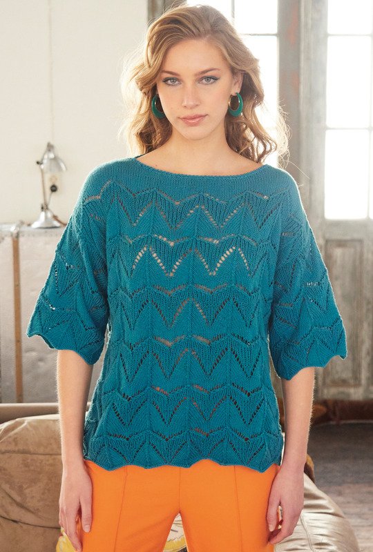 Dieser legere Pullover wird durch das All-Over-Zackenmuster richtig interessant. Die gerade Form und die kurzen dreiviertellangen Ärmel sorgen für einen lockeren Tragkomfort an warmen Tagen. Perfekt dazu passt das sommerliches Baumwollmischgarn von Lana Grossa. Gestrickt werden alle Teile einzeln von unten nach oben mit dern Nadelstärke Nr 3. Danach werden alle Teile zusammengesetzt und der Halsauschnitt noch mit Krebsmaschen behäkelt. Das sorgt für einen schönen Abschluss. Das Zackenmuster ist durch die ausführliche Strickschrift in der Anleitung super leicht umzusetzen und schnell verinnerlicht. Die Anleitung enthält die Größen 38/40 und 44/46.