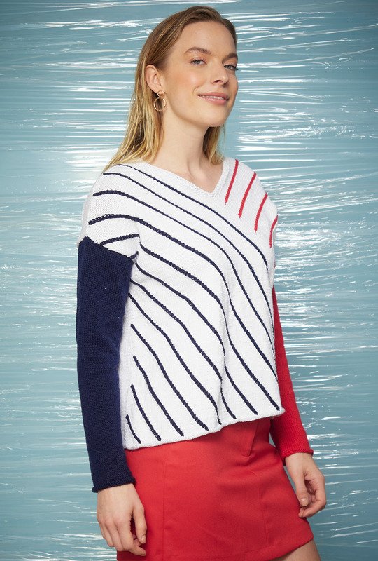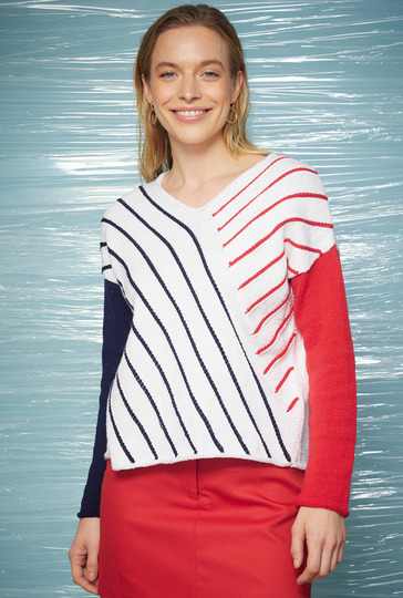 Dieser klassische geschnittene Pullover verzaubert mit einem diagonalen Streifenmuster. Das zarte Ajourmuster unterstricht den legeren Streifenlook und strickt sich einfach traumhaft. Gearbeitet wird mit Nadelstärke Nr. 4, das Garn gibt es bei Lana Grossa. Alle Teile werden einzeln von untern nach oben gestrickt. Bei der Umsetzung hilft natürlich eine ausführliche Beschreibung, eine genaue Strickschrift und ein detaillierter Schnitt. Dieser Pullover wird ganz bestimmt ein treuer Begleiter. Die Ärmel in unterschiedlichen Farben sorgen für den richtigen Kick. Nach dem Download der Anleitung kann es auch gleich losgehen in den Größen 38/40, 40/42 oder 44/46.