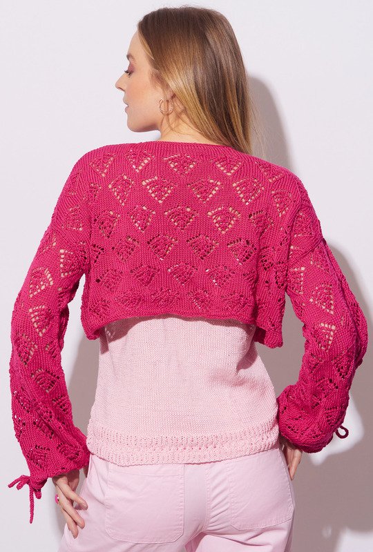 Dieses tolle Set macht richtig was her. Die Jacke mit den legeren Ärmeln und den überschnittenen Schultern wird an den Ärmeln und im Brustbereich mit kleinen Schleifen geschlossen. Das Top greift dabei das Lochmuster der Jacke im Blendenbereich wieder auf. Dabei wird die Jacke ein einzelnen Teilen gestrickt und zum Schluss zusammengefügt, während das Top in Runden von unten nach oben gearbeitet wird. Hier ist also für jeden etwas dabei. Das grafische und dennoch feminine Lochmuster ist durch die genaue Strickschrift in der Anleitung ganz einfach nachzustricken. Die Schnitte ergänzen die ausführliche Beschreibung perfekt. Das Set kann in den Größen 36/38, 42/44 und 48 gestrickt werden.