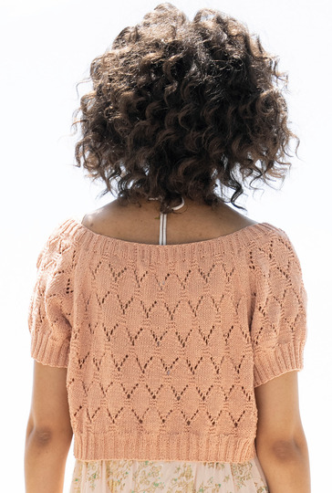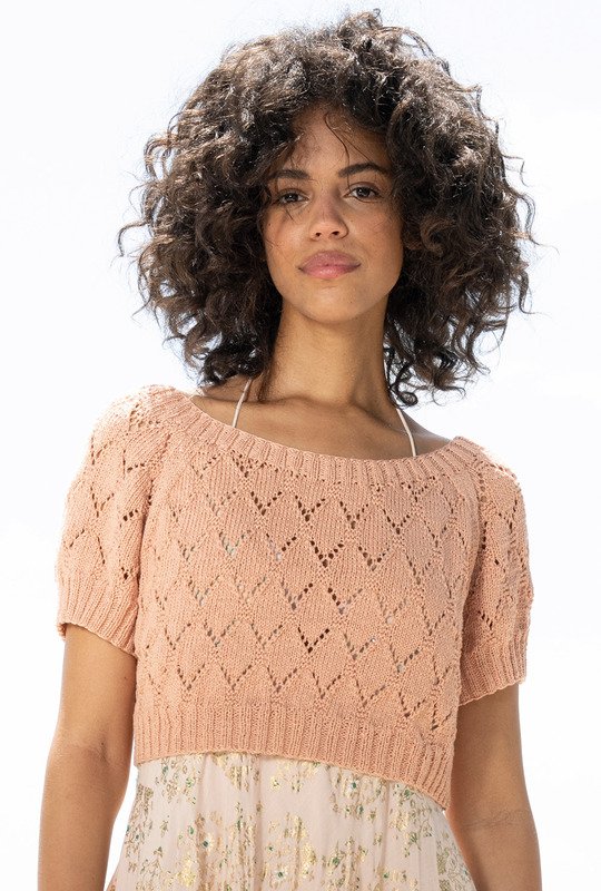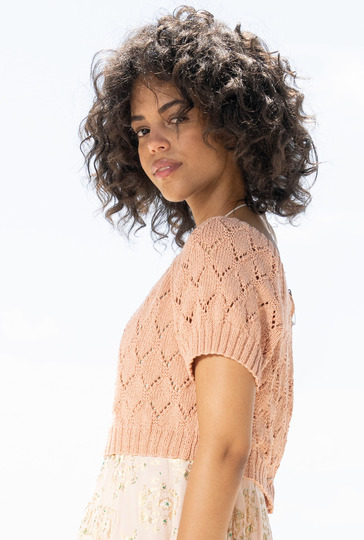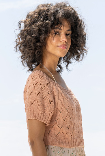 Kurz und gut: Der bauchnabelfreie Raglanpulli zeigt viel Haut und überzeugt durch ein semitransparentes Rauten-Ajourmuster, das nach wenigen Reihen ganz leicht von der Nadel geht, da es geometrisch aufgebaut ist und Dir zudem eine übersichtliche Strickschrift zur Verfügung steht. Die Raglanschrägungen sind durch die Linien aus Glatt-rechts-Streifen ebenfalls klar strukturiert und einfach zu bewältigen. Wenn alle vier Teile fertig gestrickt sind, fehlt nur noch die elastische Rippenblende, die die Hals- und Schulterpartie hervorhebt.
