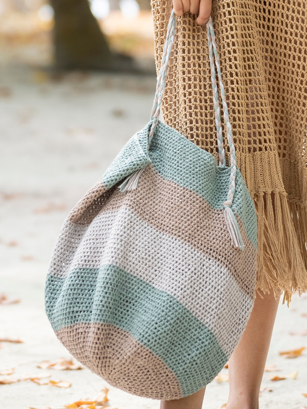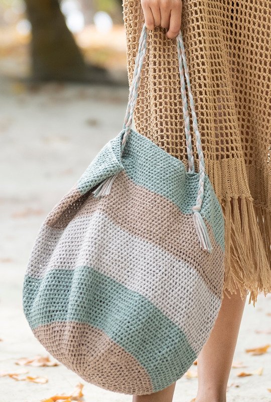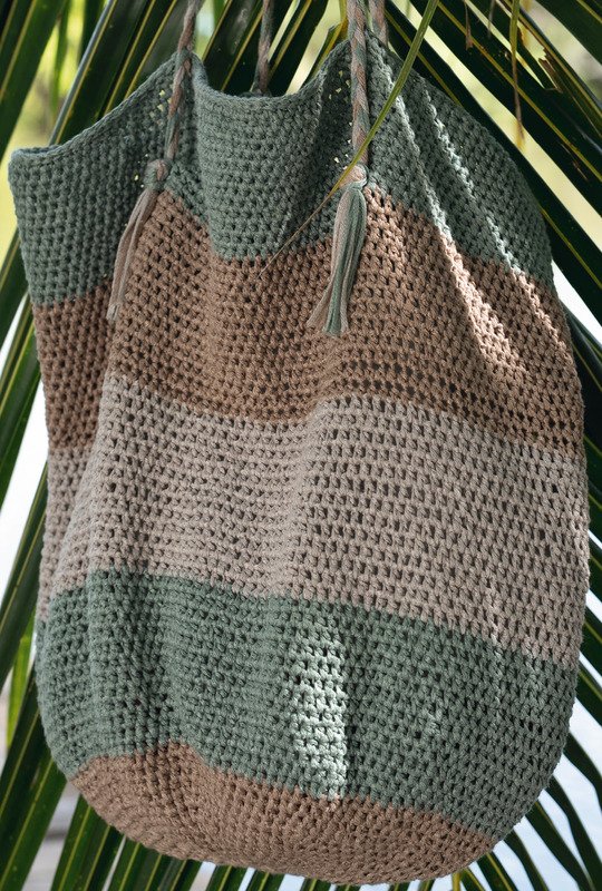Dieser gestreifte Shopper macht das Dschungelqueen-Feeling erst perfekt und besteht jedes Abenteuer. Aus höchst stabilem Leinengarn wird es mit halben Stäbchen in Spiralrunden gehäkelt und mit breiten Streifen in den Farben der Savanne versehen. Die Henkel entstehen aus 18 Fäden (jeweils 6 Fäden pro Farbe) und werden zu Zöpfen geflochten. Dann einfach die Enden mit Knoten versehen und an den oberen Taschenrand nähen.