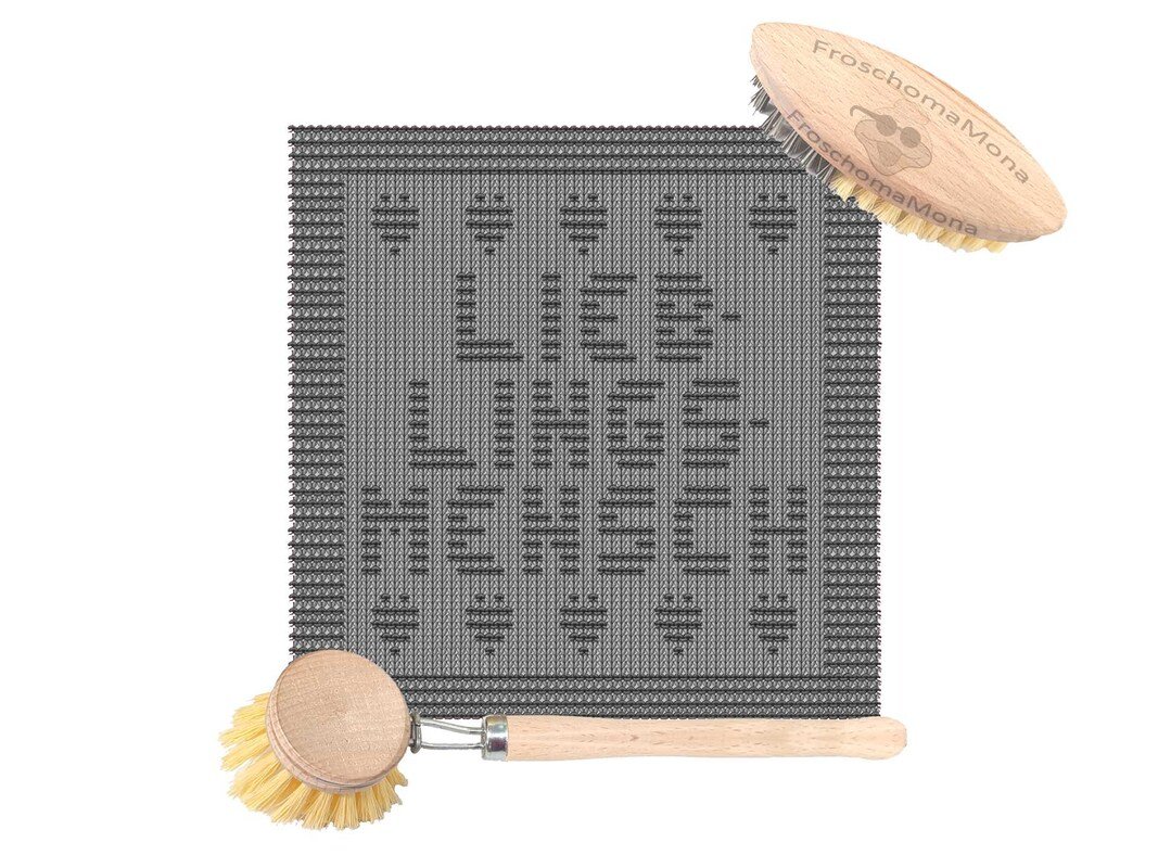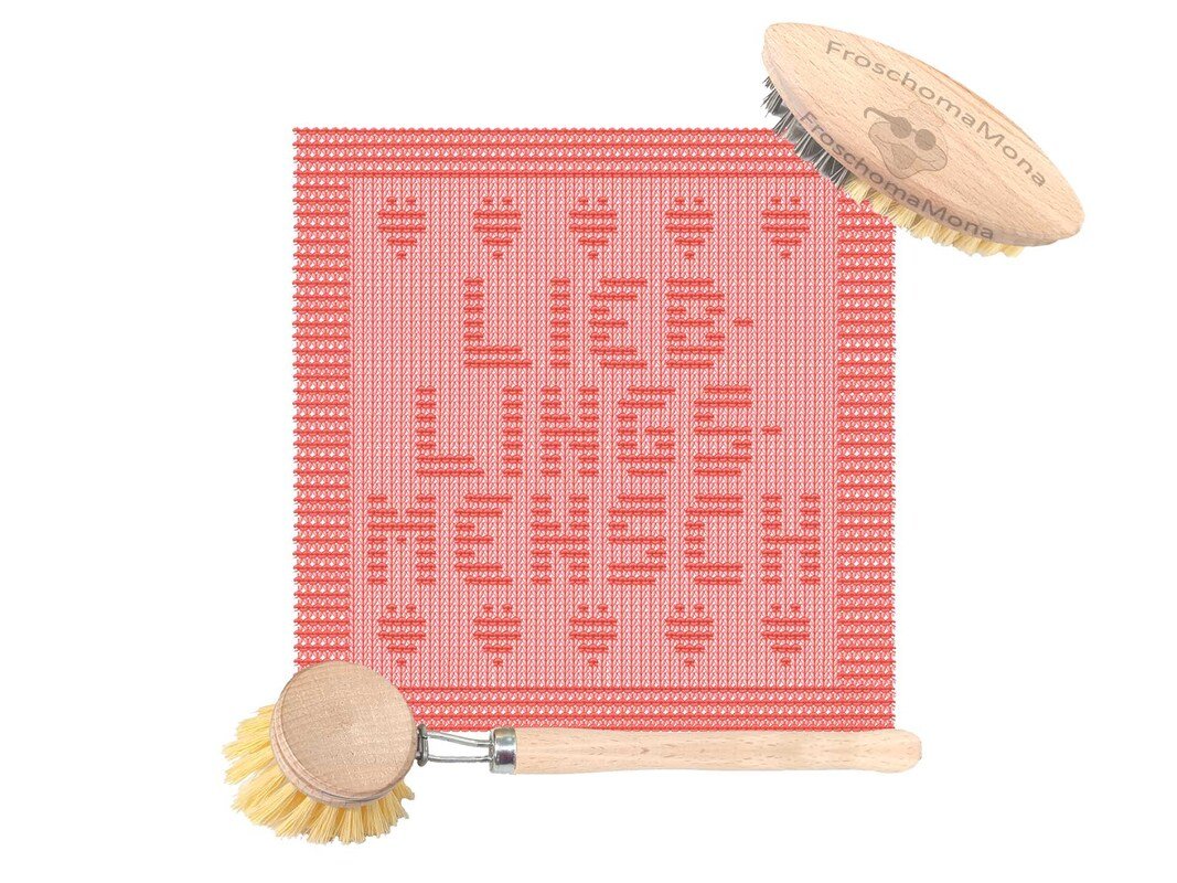 Neben der Anleitung bekommst du noch Vorlagen für verschiedene Banderolen zum Ausdrucken, falls du das Spültuch verschenken möchtest.