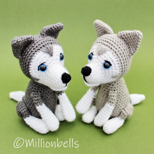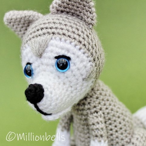 Hergestellt aus Acrylgarn (8-fädig / DK) und mit Nadelgröße 3,5 mm, wird der Husky ca. 14 cm hoch.