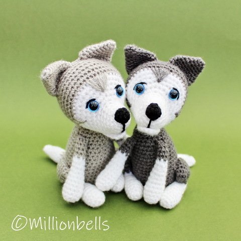 Diese Anleitung beschreibt wie man einen süßen Husky Amigurumi häkelt, wie auf den Bildern gezeigt. Hergestellt aus Acrylgarn (8-fädig / DK) und mit Nadelgröße 3,5 mm, wird der Husky ca. 14 cm hoch.