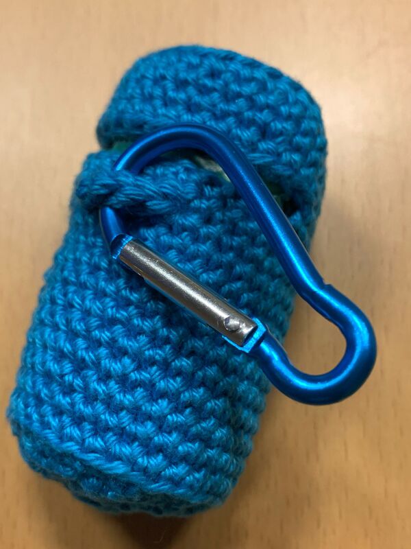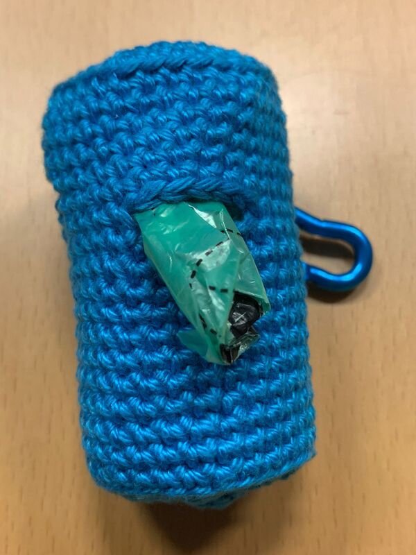 Du benötigst Wollreste, eine Häkelnadel (3 oder 3,25) und einen Karabiner. Zum Befüllen eine Rolle mit Kotbeuteln.