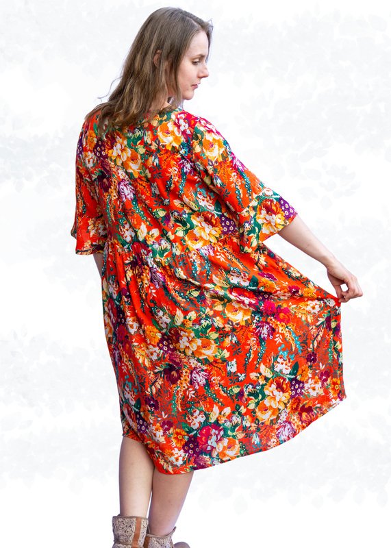 „Marie“ kannst du sowohl als Bluse als auch als wadenlanges Kleid nähen, wobei der Saum im Vokuhila-Style verläuft. Durch die A-Linie des Oberteils eignet sich die Bluse auch hervorragend zu Beginn einer Schwangerschaft.