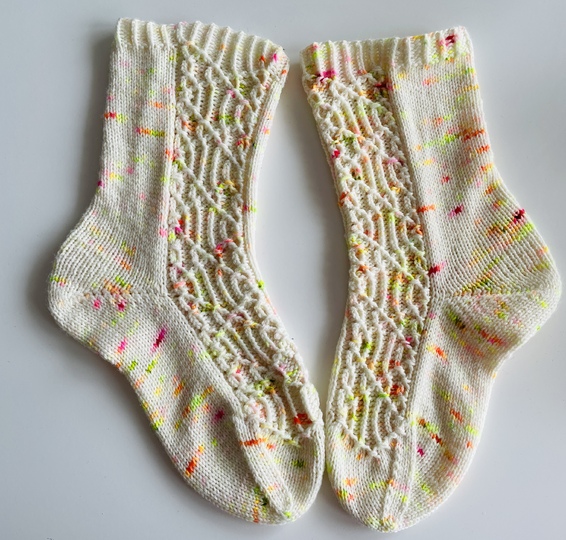 Für diese Socken gibt es zwei Varianten: 1. eine linke und eine rechte Socke oder 2. das Muster verläuft zentriert auf der Mitte von Fuß entlang. Die Socken werden oben am Bündchen begonnen und werden mit einer Bumerangferse und einer Bändchenspitze gestrickt. Es gibt eine rechte und eine linke Socke und das Muster geht über 24 Maschen am rechten bzw. linken Rand entlang. Das Muster wird mit verschränkten, linken und Wickelmaschen gestrickt. Es gibt für die rechte und für die linke Socke jeweils eine Strickschrift, genauso wie für die zentrierte Variante.