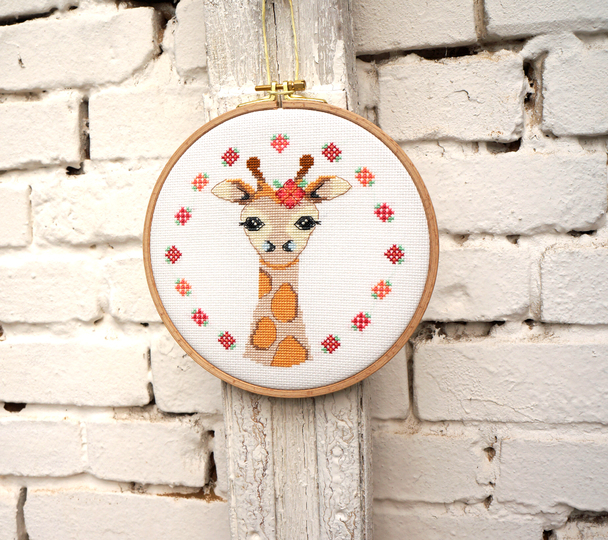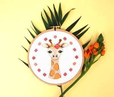 Ich habe die Giraffe auf weissen Aida von Zweigart ( 5,4 Stiche pro cm bzw 14ct ) gestickt.