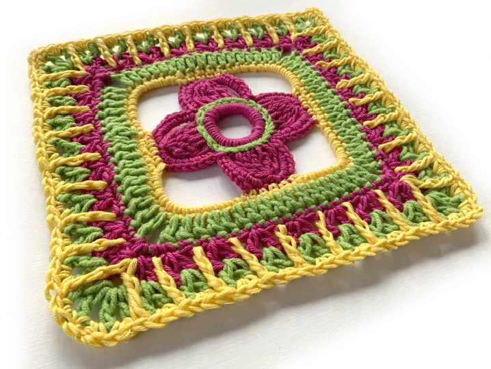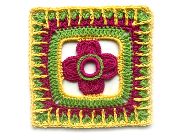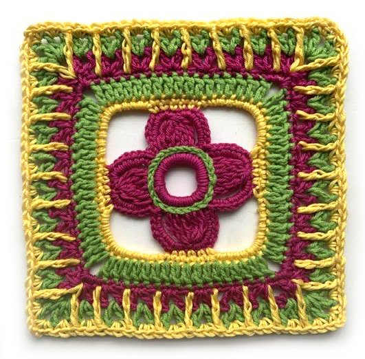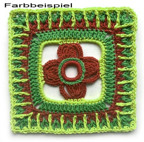 Das fertige Grannymuster Kreuzblume bei 10 RUNDEN eine Seitenlänge von 18 cm