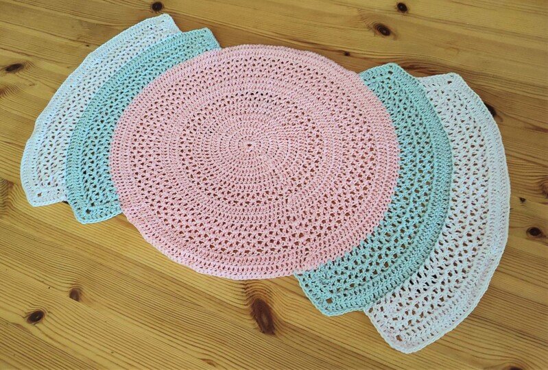Meine Testhäkler hatten verschiedene Garne, unter anderem 4fädiges uni Bobbelgarn, Ägyptische Baumwolle100% Babycotton und Schachenmeyer Catania. Plane bei Bobbelgarn für den Kreis 200m/50g und für jeden Bogen 40m/10g. Bei Schachemmeyer Catania lag der Verbrauch für den Kreis bei 64g und für jeden Bogen 13g.