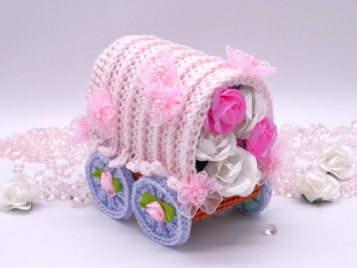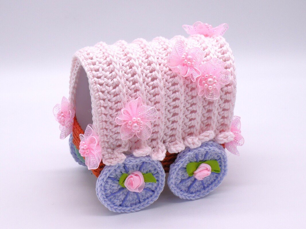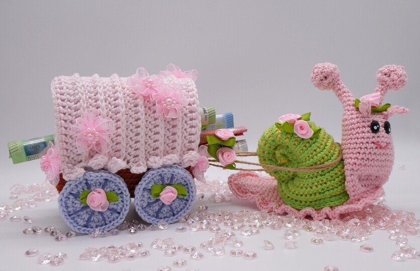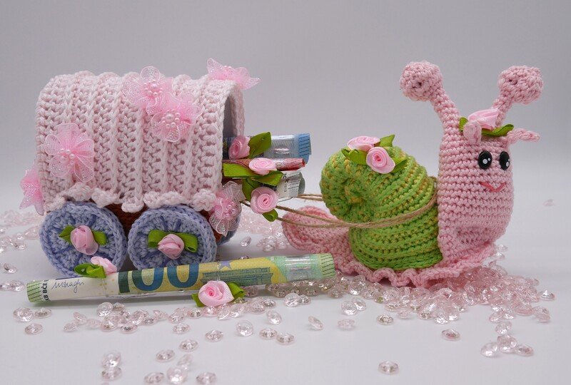 Die ausführliche Häkelanleitung mit vielen Fotos ermöglicht dir eine einfache Umsetzung des Planwagens und der niedlichen Schnecke.