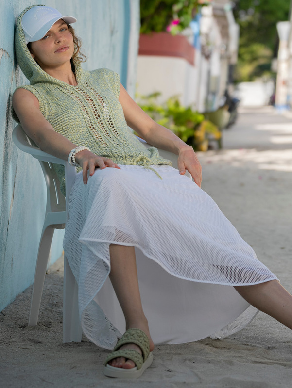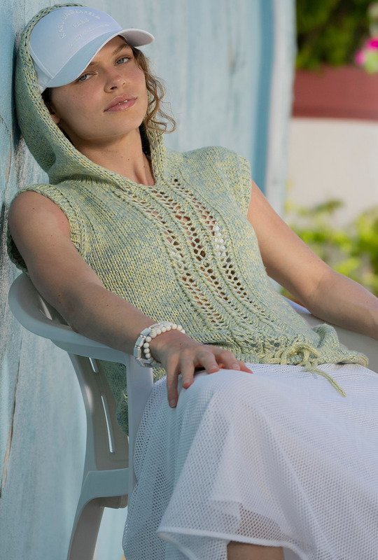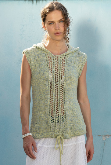 Wer keine Multicolorgarn zur Hand hat, kreiert es einfach selbst. Bei diesem doppelfädig gestrickten Pullunder habe wir den dezenten Melange-Effekt durch zwei Farben erzeugt: durch zartes Grün und helles Mint. Dadurch kommst Du auch mit dickeren Nadeln schnell zum Ziel. Daneben vermitteln Details wie der breite Lochmusterstreifen, die modische Kapuze und der variabel einstellbare Tunnelzug am Saum die äußerst coole Ausstrahlung. Das Mischgarn aus Viskose, Baumwolle und Leinen verspricht höchsten Tragekomfort.