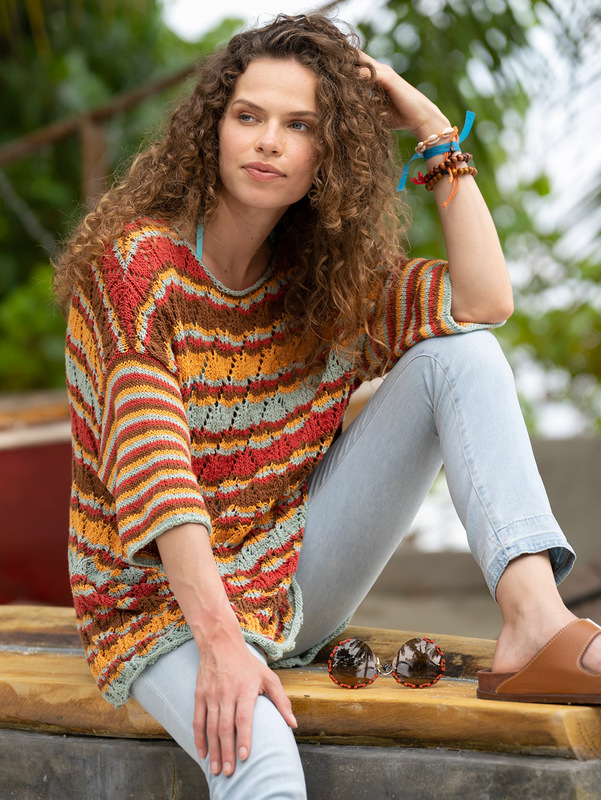 Einfach, aber effektvoll: Das an sich gleichmäßige Ajourmuster erhält die optische Raffinesse durch das Spiel mit unterschiedlich breiten Streifen und lässt dadurch den dreidimensionalen Look entstehen. Die halblangen Ärmel greifen die Nuancen wieder auf, jedoch in ruhigerer Glatt-rechts-Optik. Der gerade Schnitt und der Verzicht auf Blenden oder Bündchen machen diesen Pullover aus edlem Baumwoll-Kaschmirgarn zum Lieblingsstück für weniger versierter Strickerinnen.