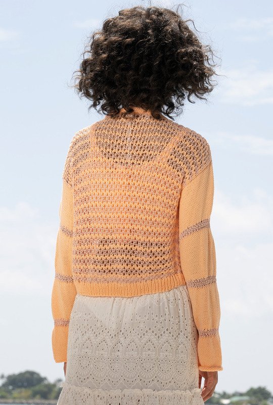 Sexy Oberteile machen in diesem Sommer Furore. Hier ist es ein bauchnabelfreies Bra-Top, das einfach glatt rechts gestrickt und mit schmalen Rippenblenden in Form gebracht wird. Wenn's etwas kühler ist, leistet die Jacke gute Dienste. Mit zwei verschiedenen Garnen in Apricot und Rosa setzt sie sich durch die Netzoptik ganz transparent in Szene. Bei den Ärmeln sorgen geraffte Streifen aus denselben Garnen für Furore. Die Raffung geht supereasy: einfach Maschen zusammen stricken und in der nächsten Reihe wieder zunehmen.