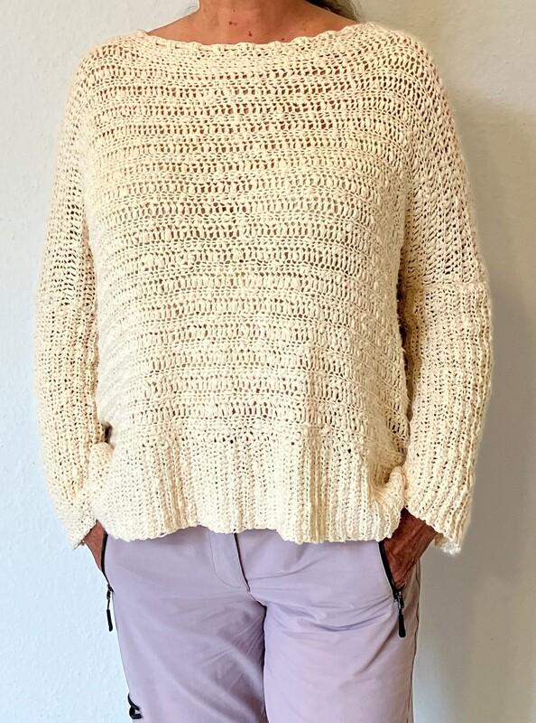 Ich hab ja früher nur gestrickt, aber dann kam ich aufs Häkeln. Ich finde es entspannender und man kann mit den verschiedenen Mustern viel gestalten. Jetzt hatte ich aber mal den Wunsch, etwas Einfaches, Schlichtes zu häkeln, so als ob man glatt rechts strickt. Es soll um den Körper schlabbern und wie Stoff nach unten wallen. Das ist mir mit diesem Pullover gelungen, finde ich. Das Garn ist ungleichmäßig dick, das lässt das Gewebe so naturbelassen wirken. Und das Muster bildet von alleine waagerechte Streifen, so als hätte man quer gestrickt. Ich hatte diesen Pulli in diesem kalten Mai schon oft an. Er kaschiert einfach wunderbar mein Bäuchlein…