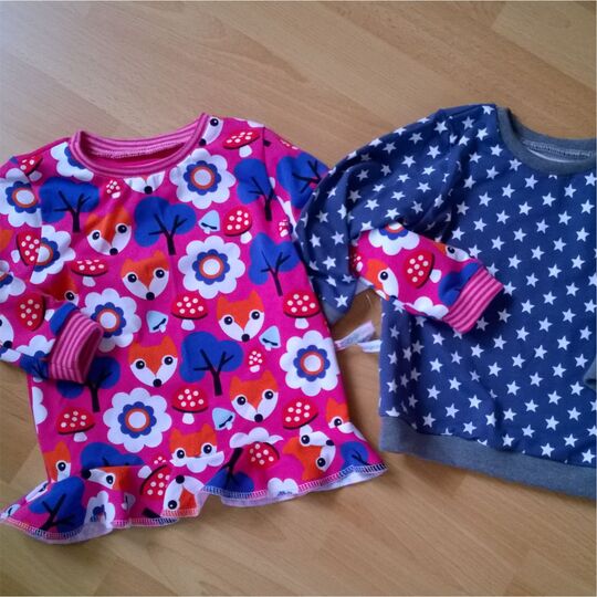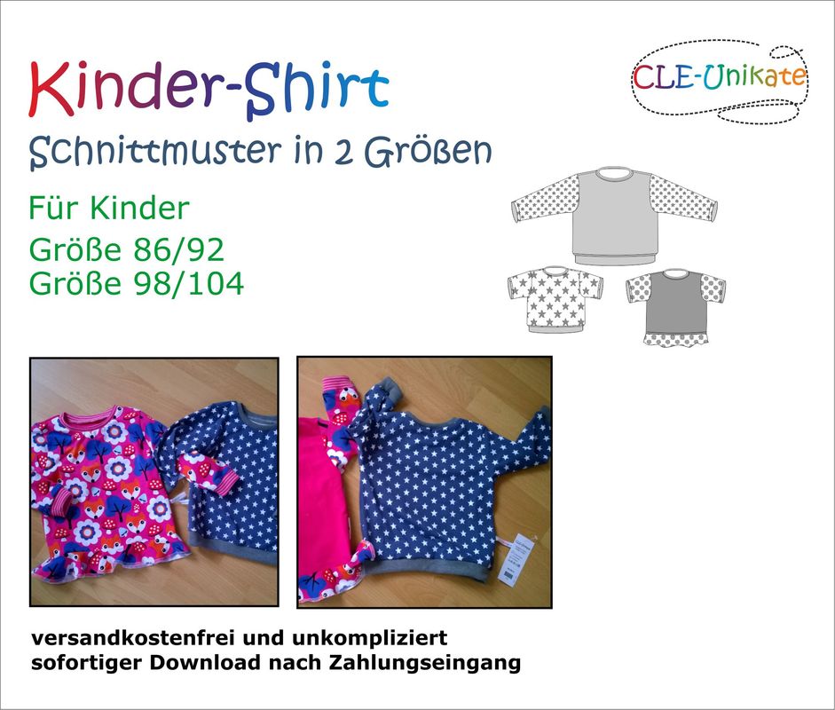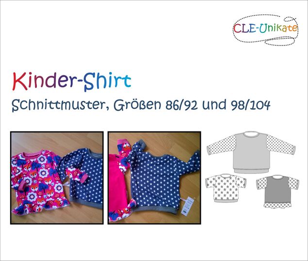 Das Ziel dieses Schnittmusters ist ein Kinder-Shirt mit kurzen oder langen Ärmeln in zwei Größen. Für Mädchen kann ein Volant am Saum angebracht werden. Genäht wird es wahlweise aus gemustertem und/oder einfarbigem Jersey sowie Bündchenstoff.