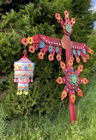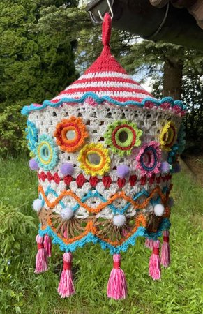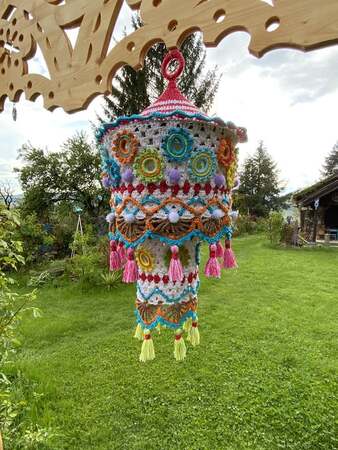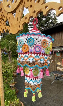 Der Große Lampion mit selbst gemachten Spiegelchen ist ein echter Blickfang für Garten, Wohnung, Balkon..usw...und macht immer Freude, wenn man hinschaut....kein Wunder: Hat das häkeln selber schon so Spaß gemacht!