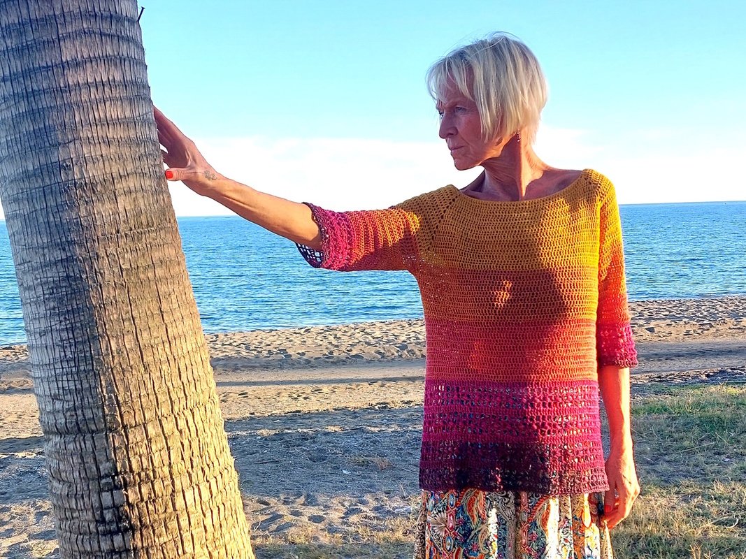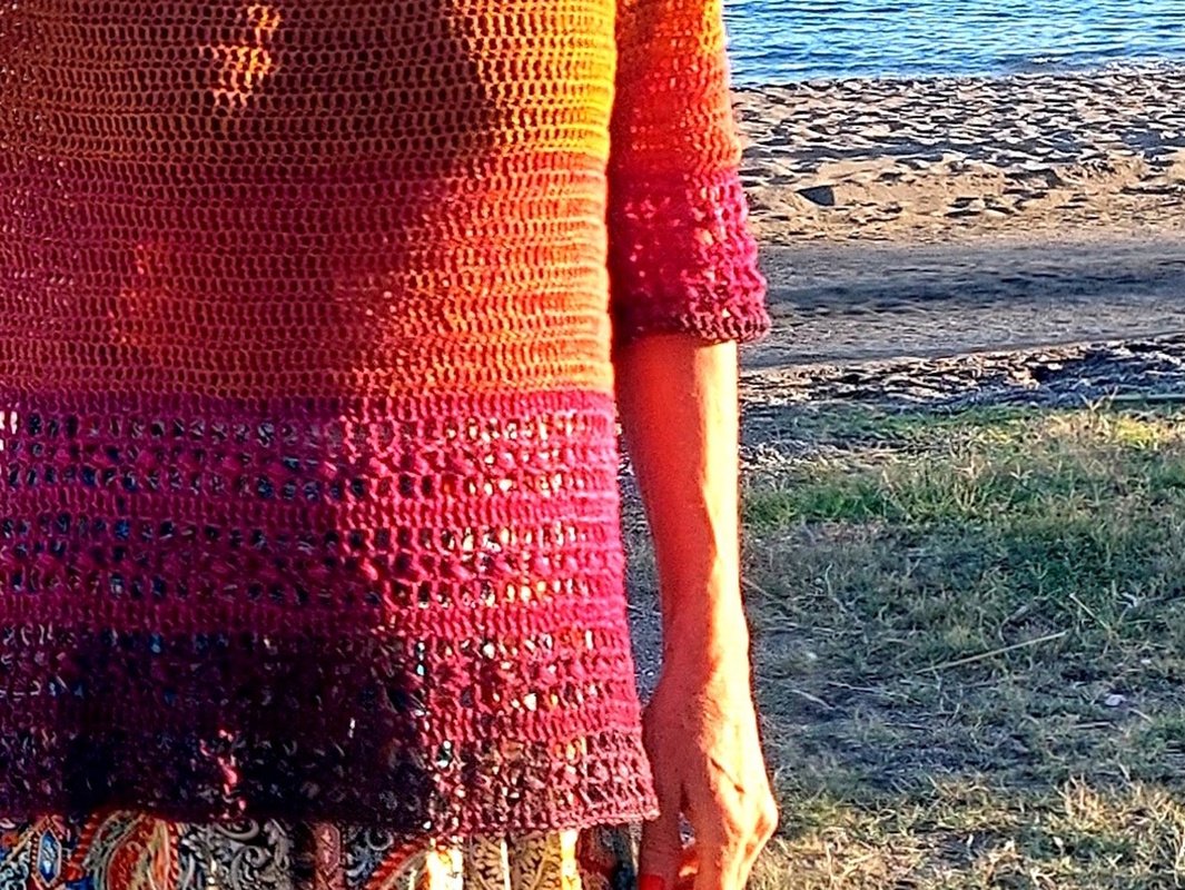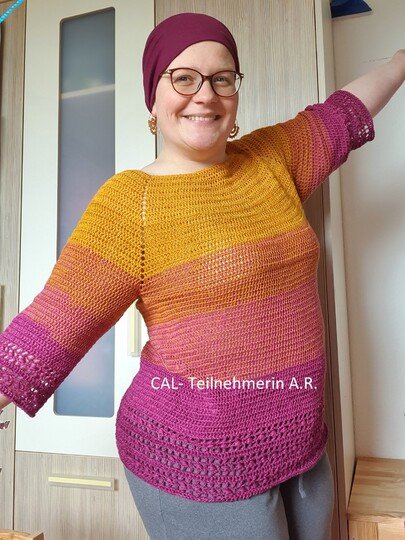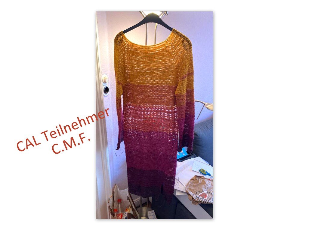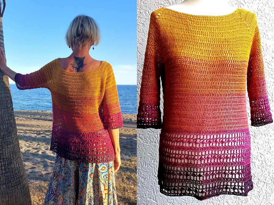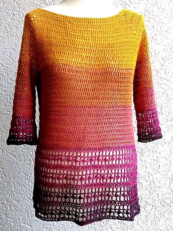 Die Tunika wurde in einem CAL mit ca. 100 Teilnehmern gehäkelt. Auch Anfängerinnen haben ihr erstes Oberteil fertig bekommen. Das Oberteil kann einfarbig oder mit Farbverlauf gehäkelt werden (s.Bilder).