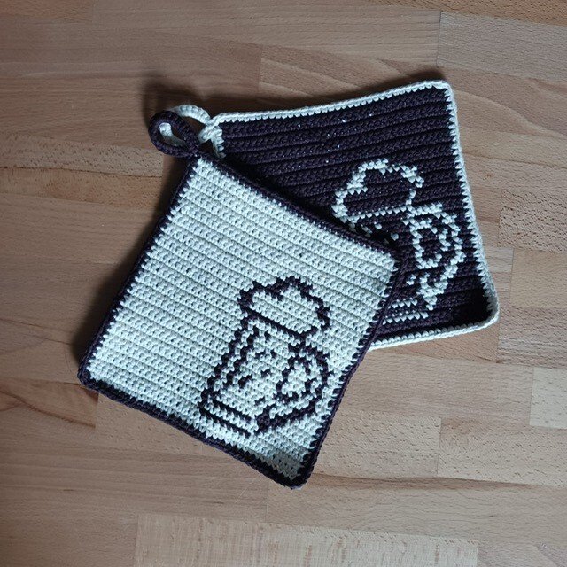 Mit der von mir verwendeten Wolle hat der Topflappen eine Größe von ca 20cm x 20cm.