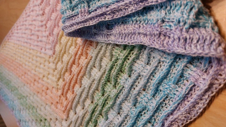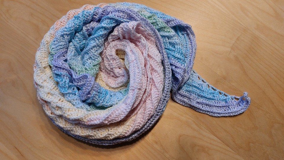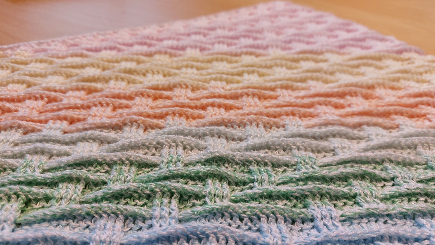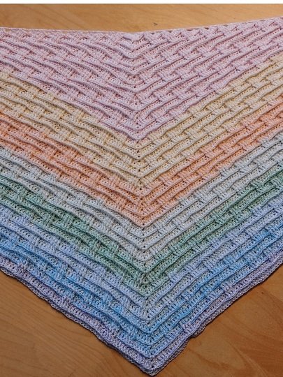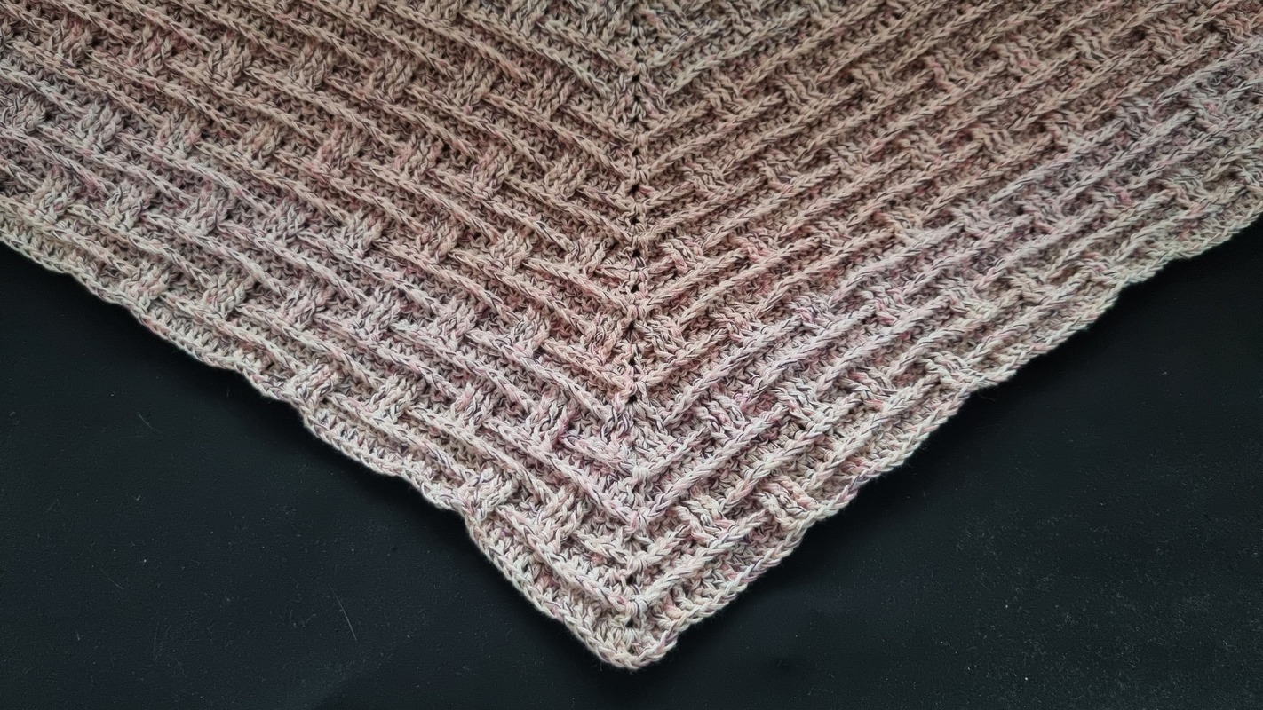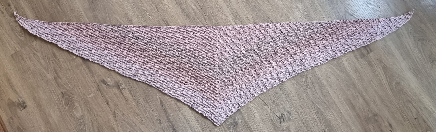 Es ist ein flaches Tuch, das durch den Maschenmix aus Reliefstäbchen und Stäbchen eine sehr schöne Struktur ergibt. Es ist absolut anfänger- und fernsehtauglich durch den einprägsamen Rapport.