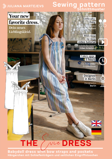 Das Schnittmuster als Ebook für dein neues Sommerkleid "The Evie Dress". Mit schriftlicher, bebilderter Nähanleitung und kostenloser Video-Anleitung auf unserem YouTube-Kanal JULIANA MARTEJEVS - Das DIY-Modelabel oder unserer Website (s. Profil).