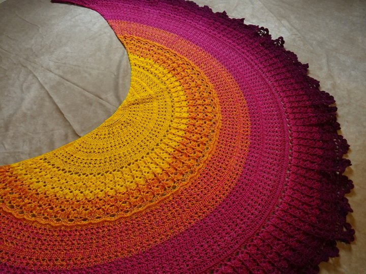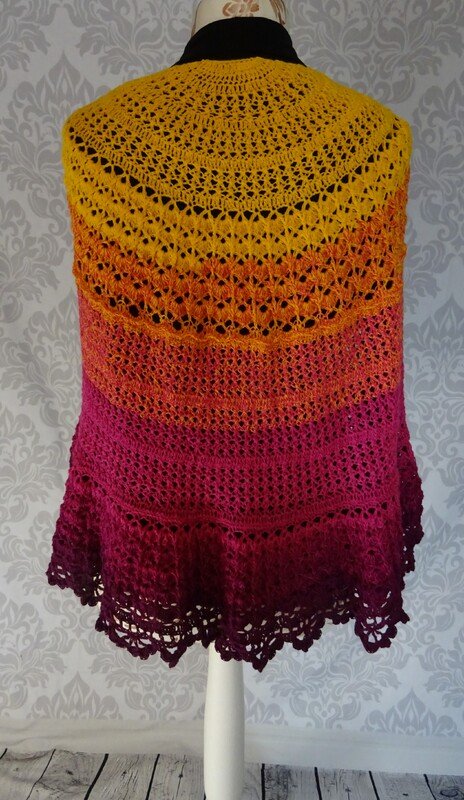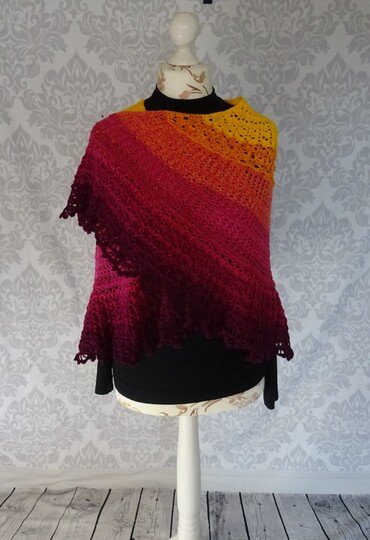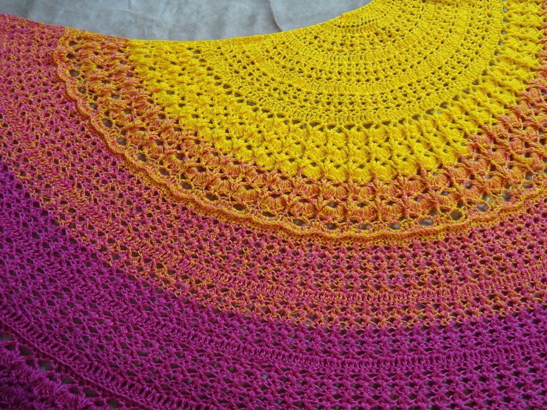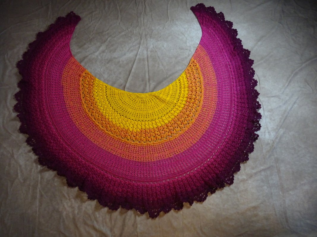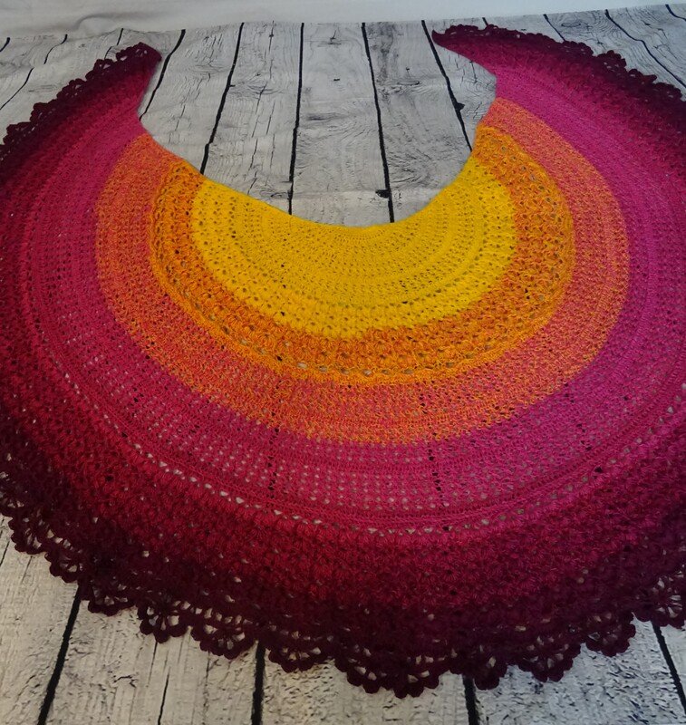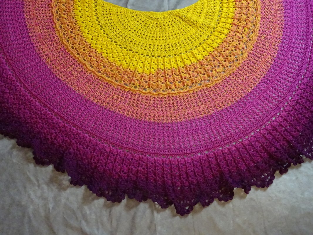 Ich habe einen 2000mll/3fädigen (ca 124cm x 64cm) Bobbel von Jaci´s Bobbel „Purpur-Sonne“ verwendet und mit einer Häkelnadel 3,0 gearbeitet
