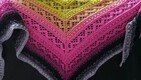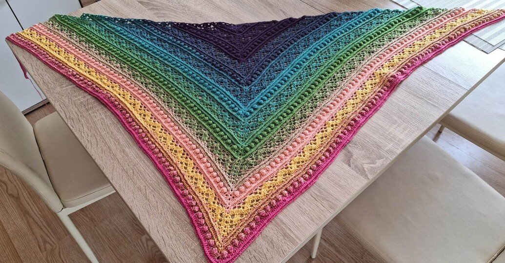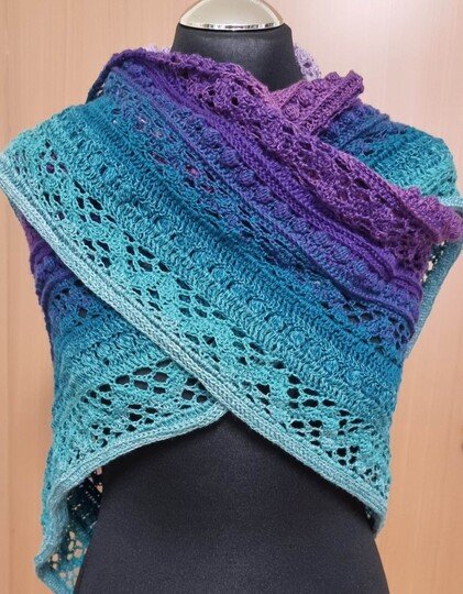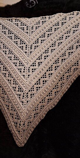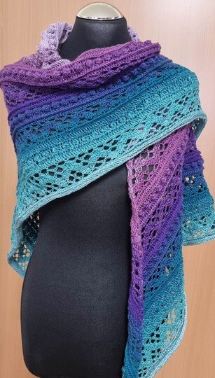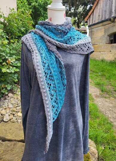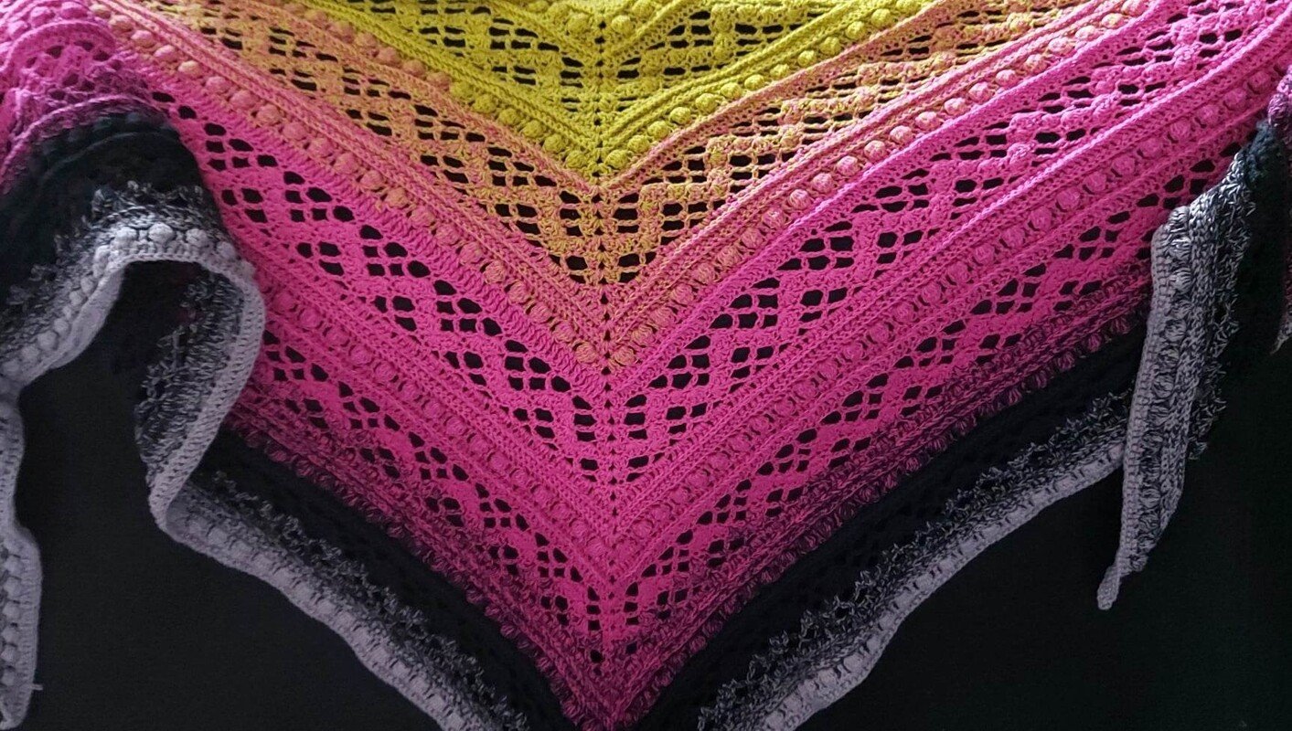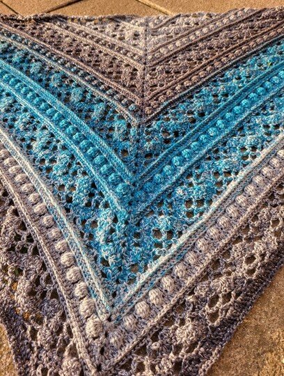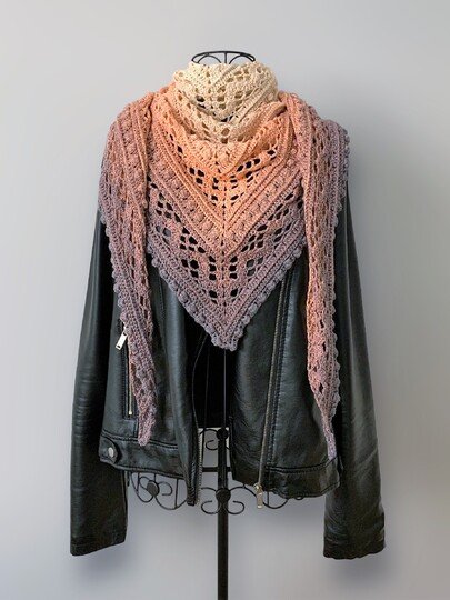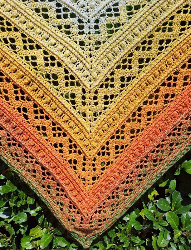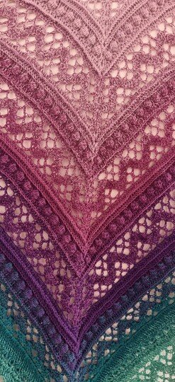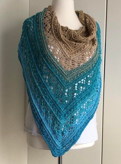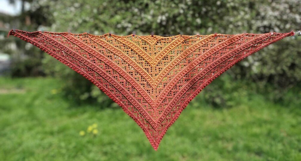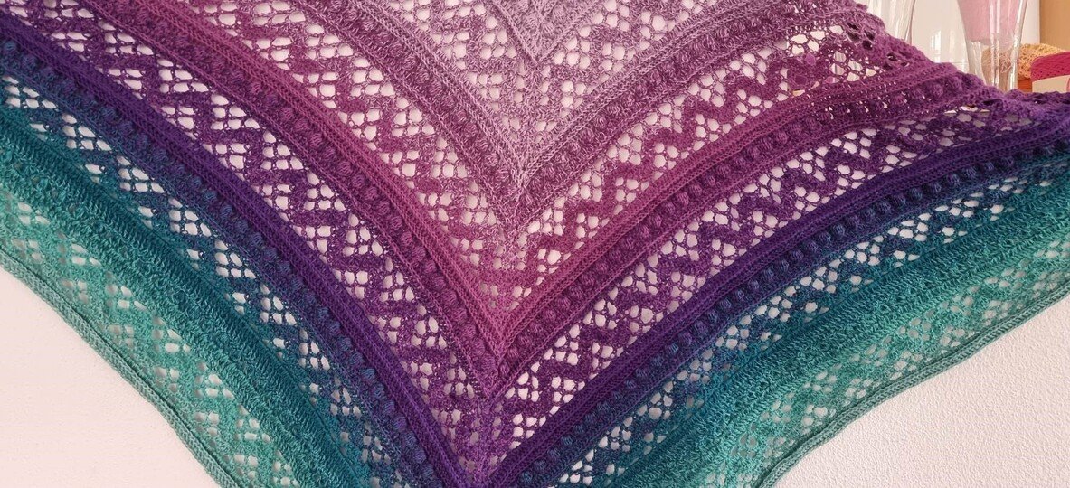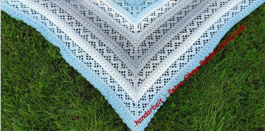 Das Dreieckstuch Aglaia ist ein symmetrisches Tuch, das in jeder beliebigen Größe gehäkelt werden kann, da sich die Reihen wiederholen.
