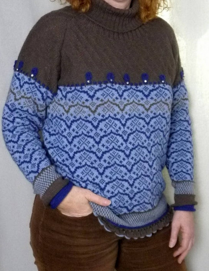Hier gibt es Rollbündchen, eine schöne Borte, Kordel mit Glitzersteinchen zu entdecken. Es werden ein Rollkragen und 3 aparte Muster gestrickt.