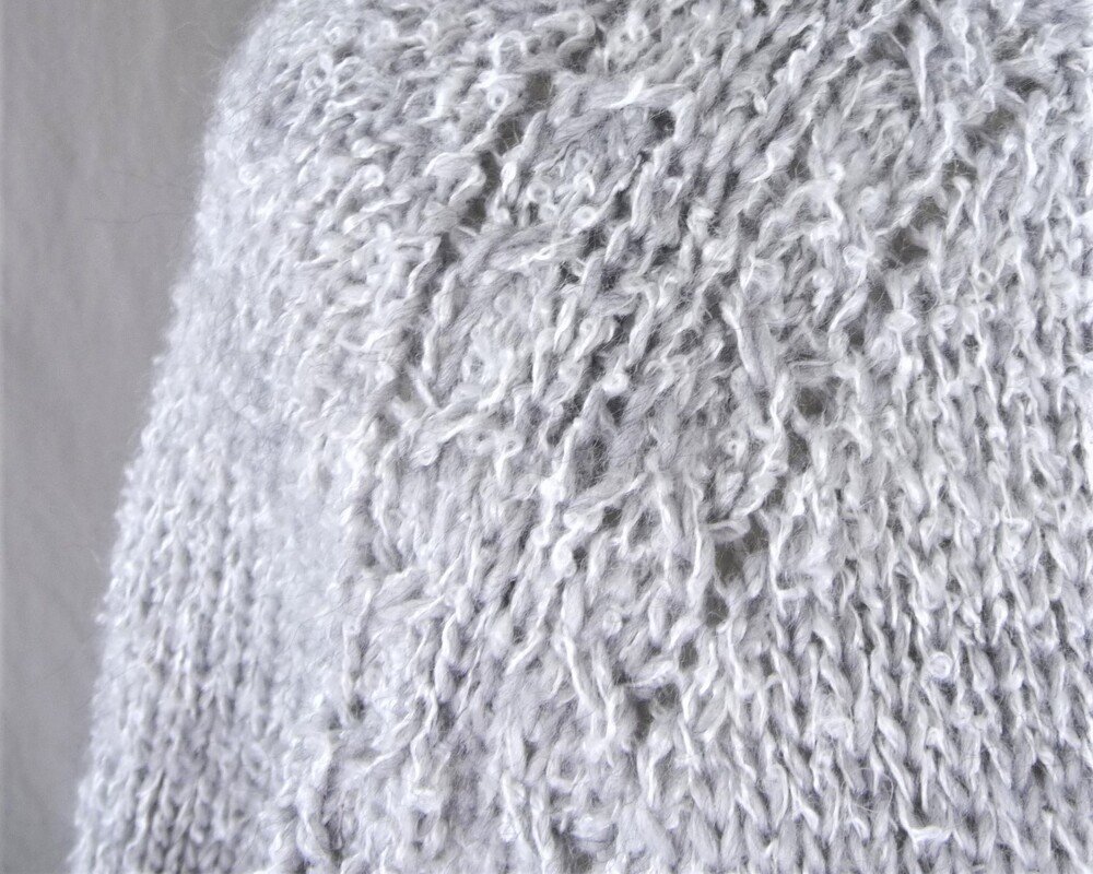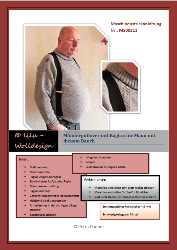 Es wird erklärt, wie ein Raglan zu entwerfen ist. Paßt also für alle Größen und Maschinen. Ich habe an einer Brother, KH970 mit DB gestrickt. Aber auch wenn Sie eine andere Maschine haben (z.B. Empisal) und Sie wissen, wie Ihr Schlitten auf verkürzte Reihen einzustellen ist, können Sie diese Anleitung gut verwenden. Der Raglan wurde mit einem Zopf gestrickt.