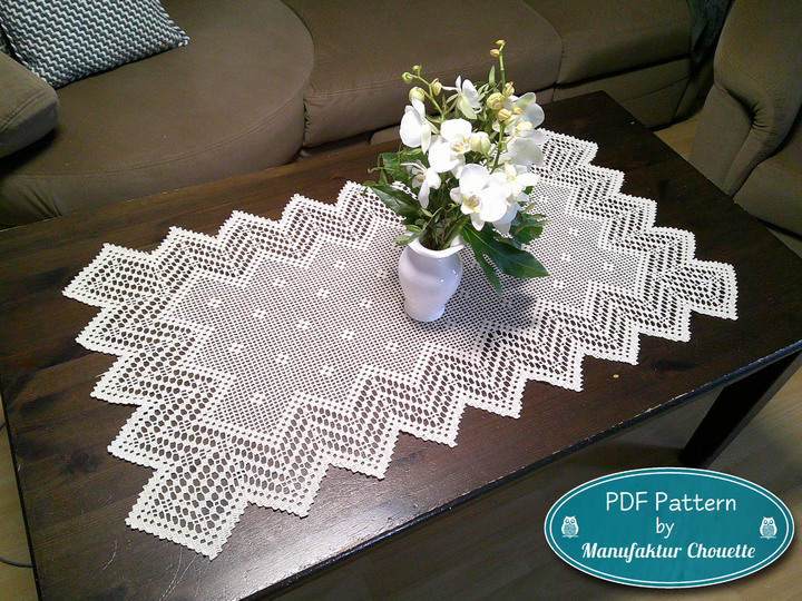 Wenn Du mit den angegebenen Materialien häkelst wird der Tischläufer mit 5 x 9 Zacken etwa 54 x 95 cm groß.