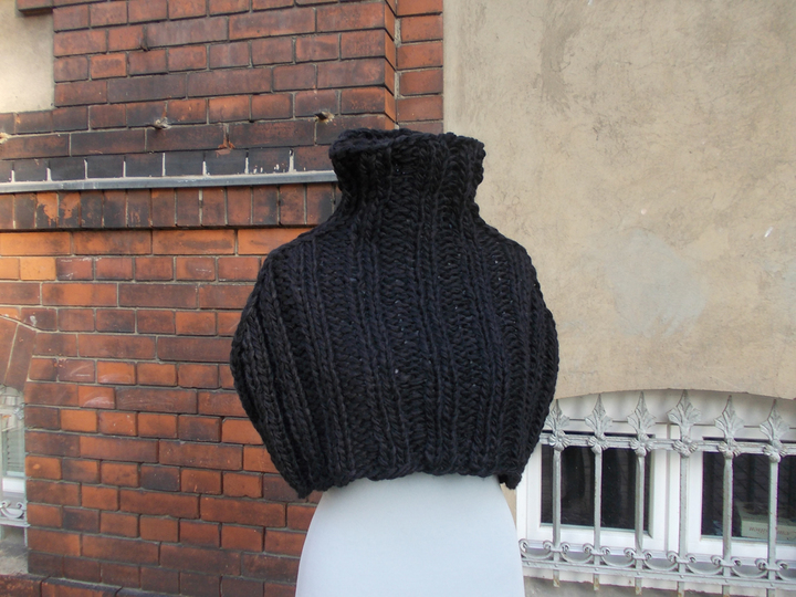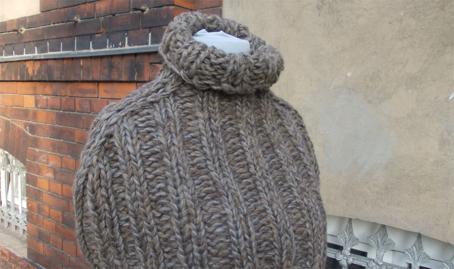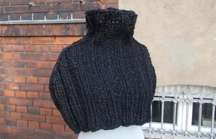 Es wird mit dicken Nadeln gestrickt. Ich habe für mein Modell Alpaka-Wolle (2fädig) verwendet.