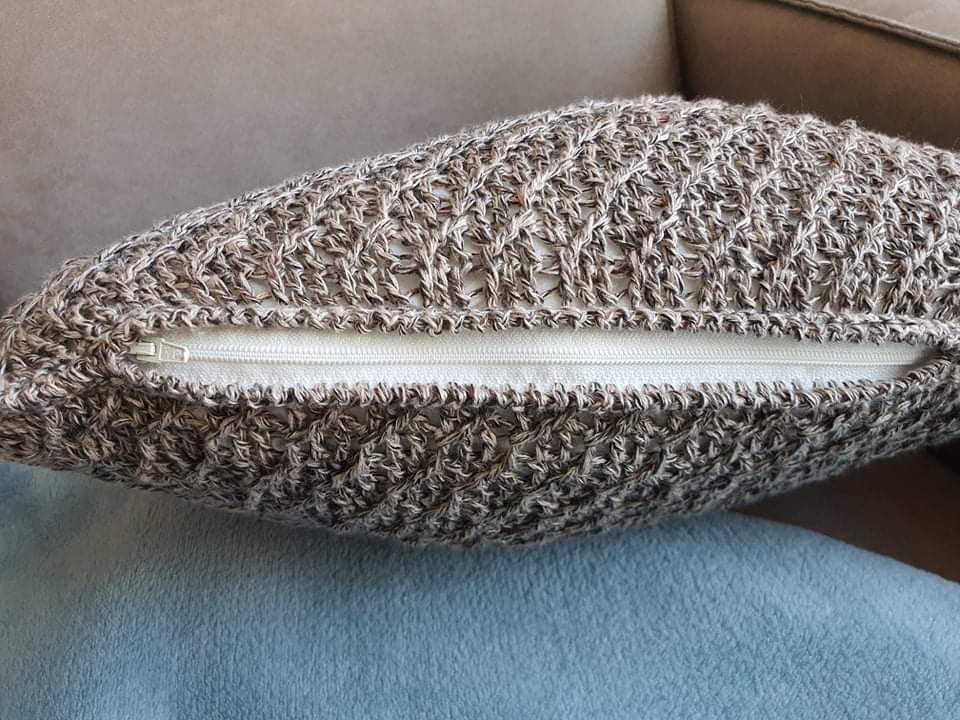 Für eine Kissenhülle in der Größe 40 x 40 cm wurden 850 m Lauflänge eines Bobbels (Farbverlaufsgarn), 3-fädig, mit Nadelstärke 3 verarbeitet. Das Muster wurde beidseitig gearbeitet.