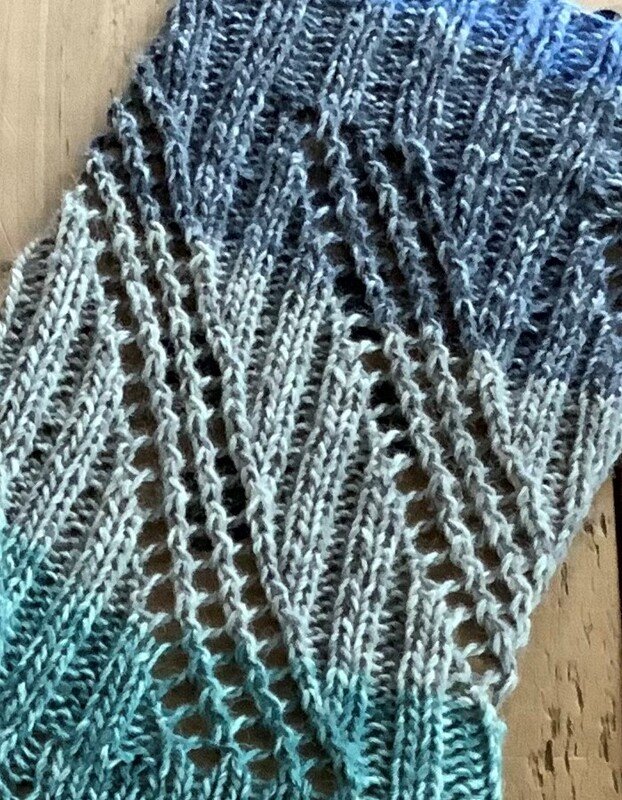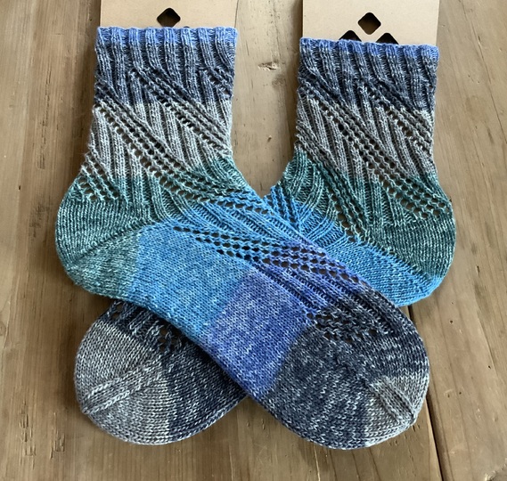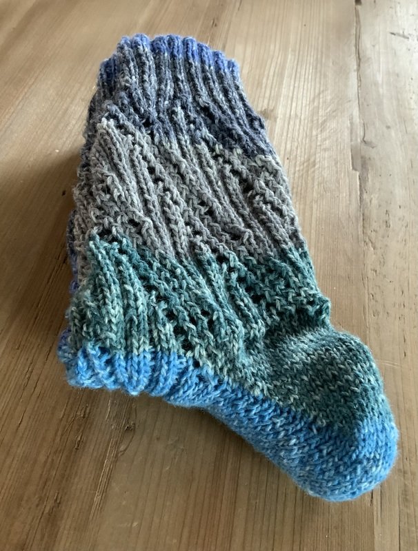 „Bichette“, schön gemusterte Socken mit einem Loch-Rippenmuster. Die Socken werden von oben nach unten gestrickt. Ich habe die Ferse als Bumerangferse gearbeitet und eine Bandspitze gestrickt und beschrieben. Ferse und Spitze können jedoch auch anders ausgeführt werden.