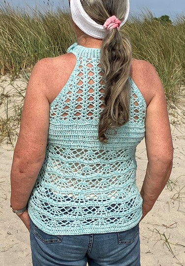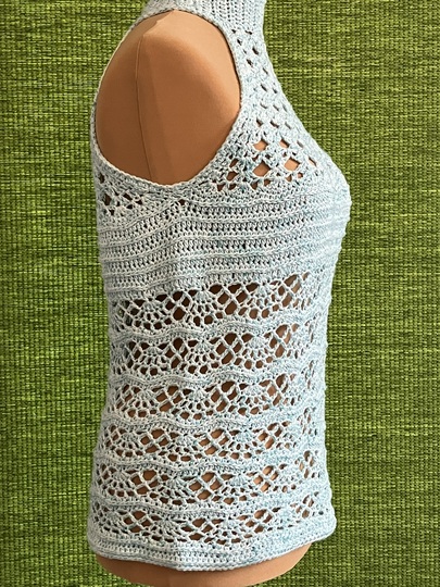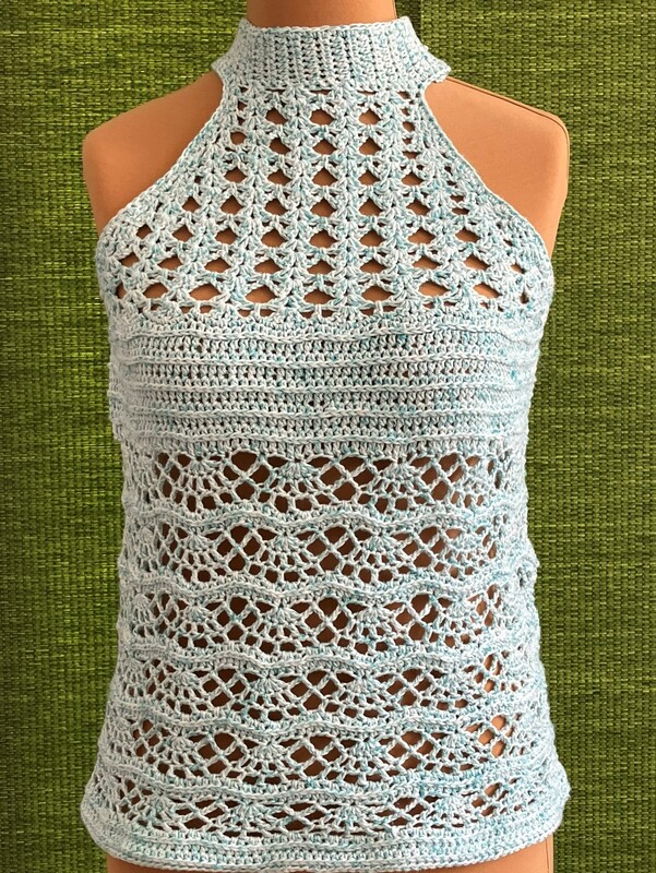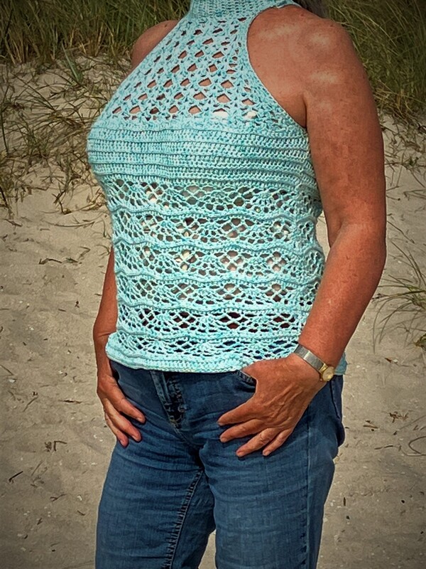 Dieses Shirt ist einfacher zu häkeln, als es aussieht. Man häkelt einfach von oben nach unten (ohne Naht, also in einem Stück), genau so, dass es passt. Es kann ja jederzeit anprobiert werden. Die Farbe, die man wählt ist vollkommen offen, auch wie lang man es macht ist Geschmacksache und wird in der Anleitung gezeigt.