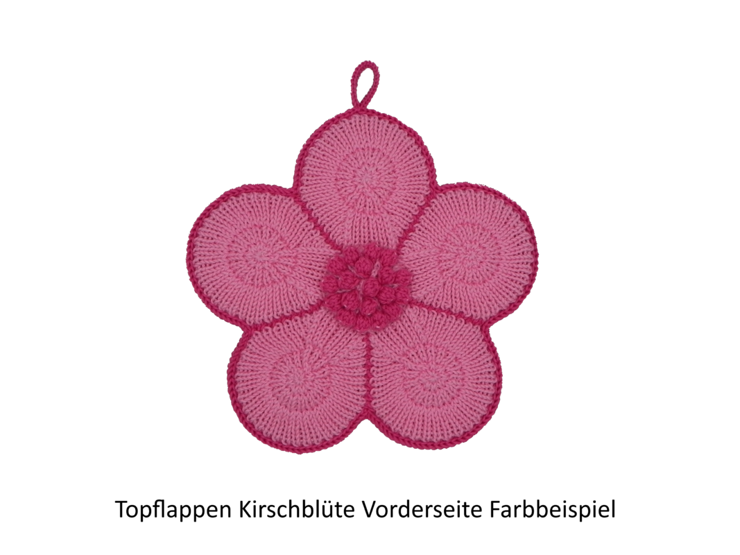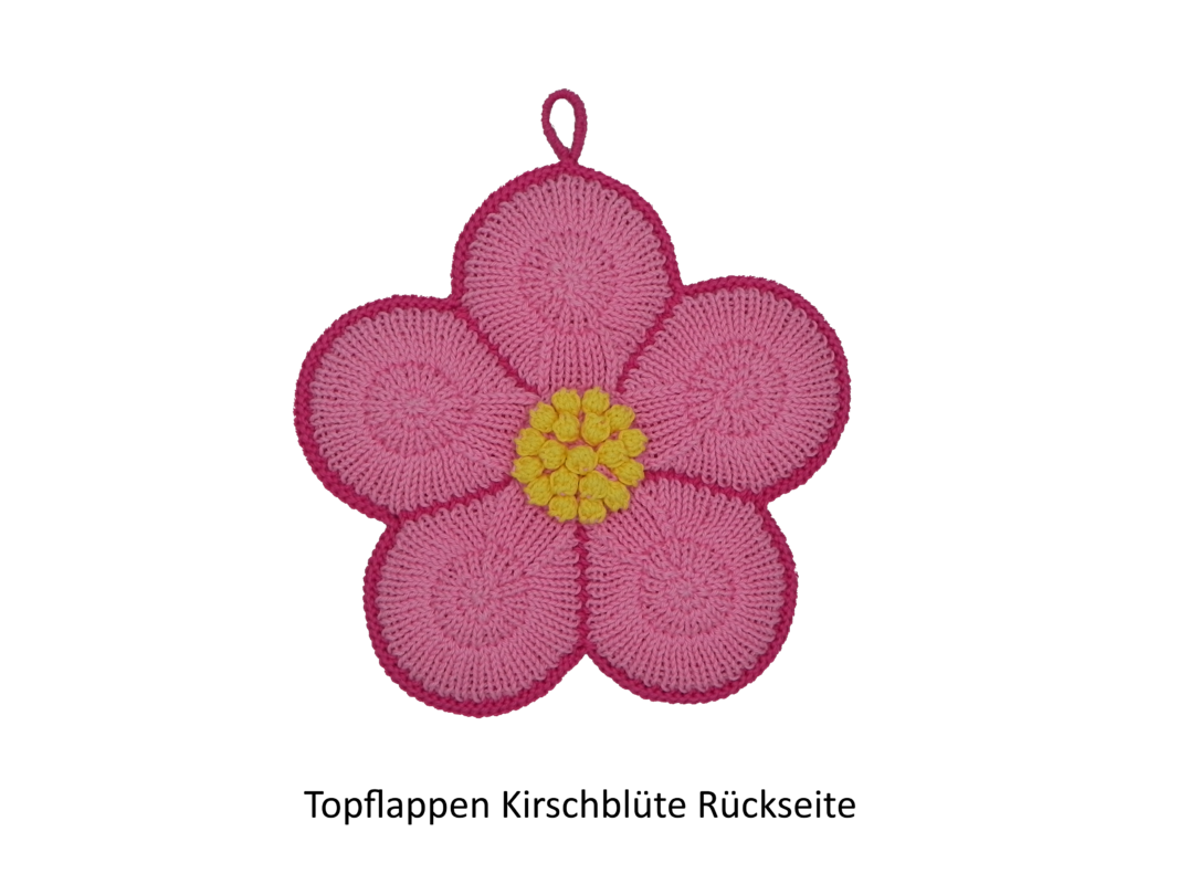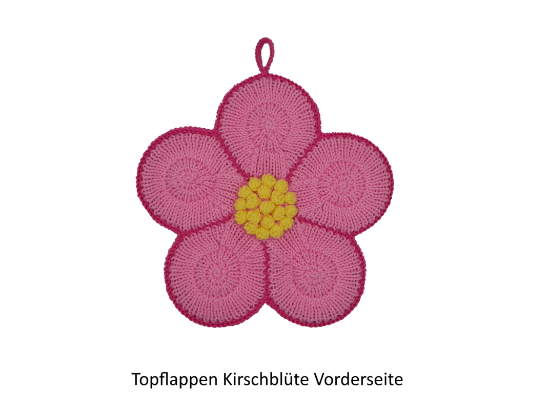 Dies ist eine Anleitung zur Herstellung eines gestrickten Topflappens in Form und Aussehen einer Kirschblüte.
