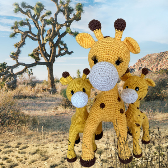 Auf den Bildern sieht du die Giraffen in zwei Größen. Es handelt sich dabei aber nicht um zwei Anleitungen sondern um dieselbe Anleitung. Die Giraffen wurden nur mit unterschiedlicher Wolle und Nadelstärke gehäkelt.